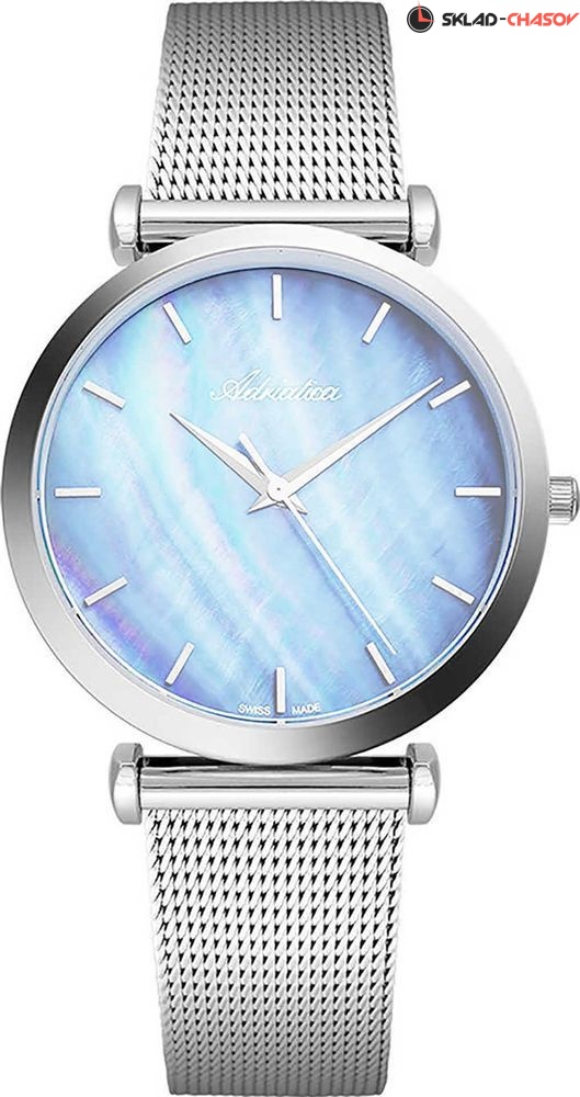 Классические женские наручные часы Adriatica на стальном браслете миланского плетения. Точность хода обеспечивает швейцарский кварцевый механизм ETA F04. Вес часов 65 грамм. Гарантия 2 года.