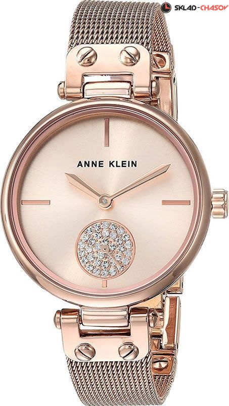 Стильные часы от Anne Klein на браслете, выполненном в технике миланского плетения. Циферблат украшен кристаллами Swarovski. Секундная стрелка вынесена на отдельный циферблат. Гарантия 2 года.