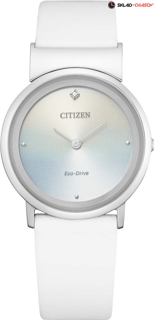 Ультратонкие женские наручные часы на кожаном ремешке. Циферблат украшен искусственным бриллиантом. Система Eco-Drive, не требующая замены батарейки. Питание от солнечной энергии, запас энергии на 240 дней. Функция индикации заряда (EOL) и предотвращения перезарядки. Циферблат закрывает устойчивое к потертостям и царапинам сапфировое стекло. Титановая задняя крышка. Ремешок из синтетической кожи с классической застежкой. Вес часов всего 18 грамм. Гарантия 1 год.