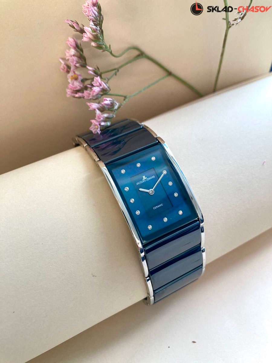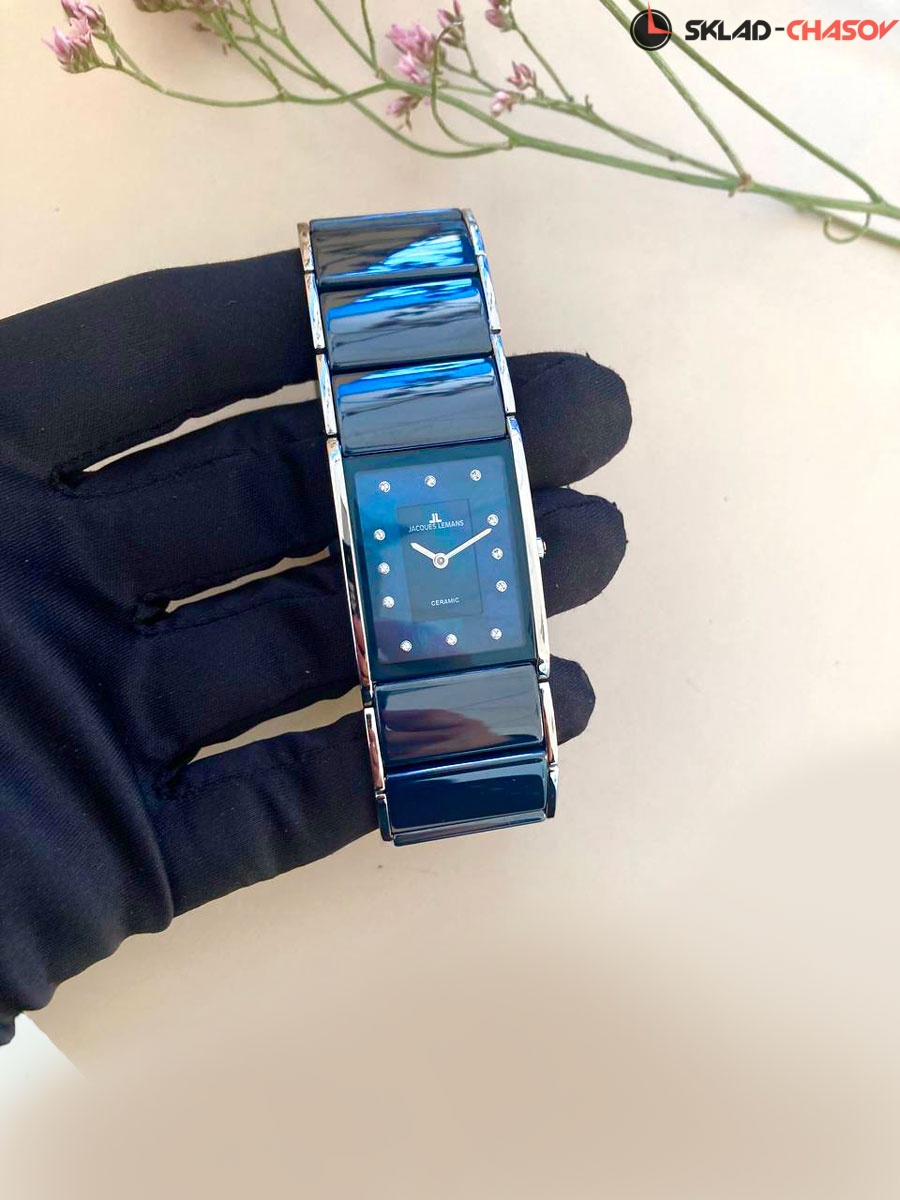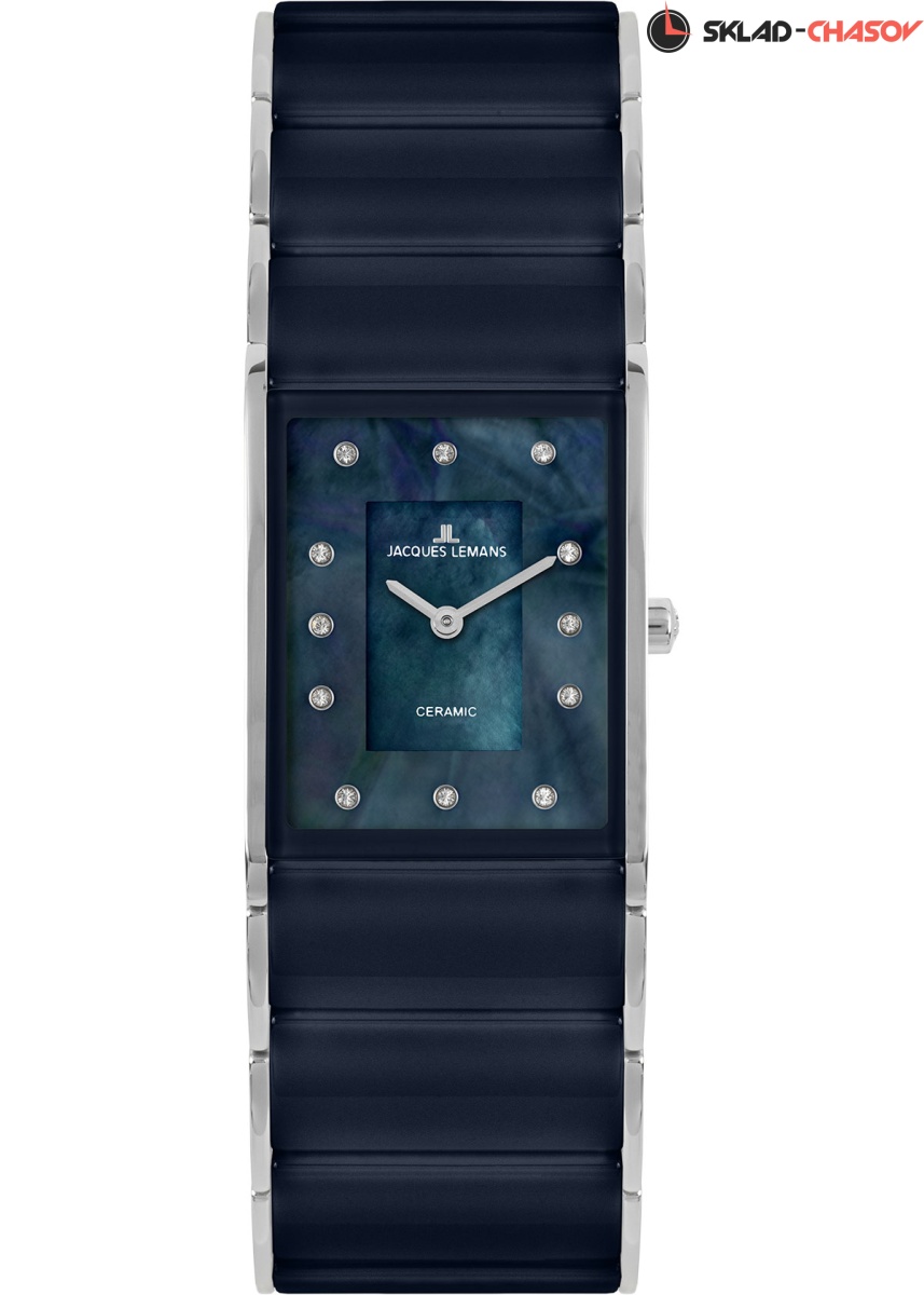 Элегантные и статусные часы с кварцевым механизмом. Их прямоугольный корпус плавно из нержавеющей стали перетекает в браслет, звенья которого сделаны из высокотехнологичной керамики синего цвета. На модели установлена удобная в использовании застежка-клипса, ее механизм раскрытия приводится в действие двумя кнопками, расположенными по бокам. Двухуровневый синий циферблат часов сделан из натурального перламутра. Оттенок этого природного материала способен меняться в зависимости от освещения. В качестве маркеров дизайнеры Jacques Lemans используют кристаллы Swarovski. Циферблат надежно защищен минеральным стеклом с сапфировым напылением.