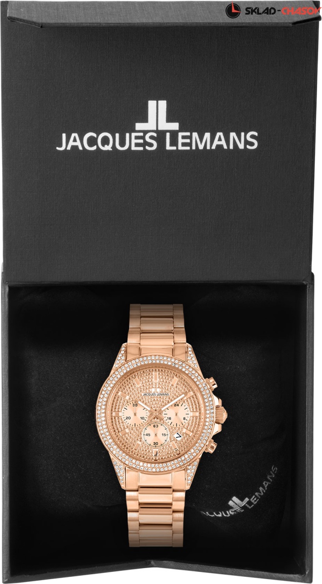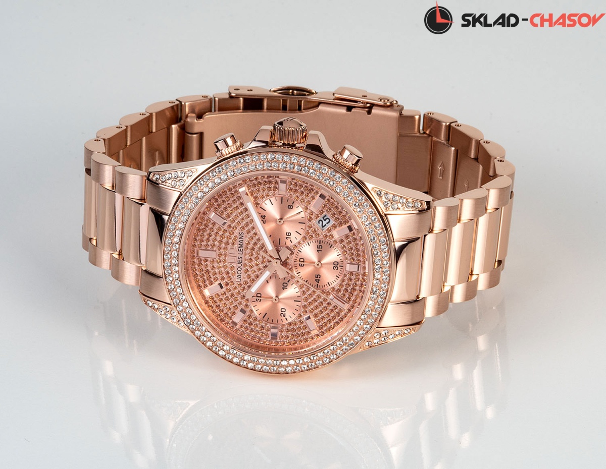 Роскошный хронограф с кварцевым механизмом в стиле sporty chic. Корпус диаметром 42 мм сделан из нержавеющей стали с PVD-покрытием из золота желтого оттенка. Безель украшен двумя рядами сияющих кристаллов Swarovski. На золотистом циферблате, усыпанном кристаллами, размещены крупные полированные риски, индикатор, отображающий время в формате 24-х часов, минутный (до 30 минут) и секундный (до 60 секунд) накопители и апертура даты. В модели установлено ударопрочное минеральное стекло Crystex. Водостойкость равна 10 атмосфер. Браслет часов из стальных звеньев с PVD-прокрытием завершает надежная и удобная в использовании застежка-клипса с двумя боковыми кнопками. Эти часы — больше, чем просто аксессуар для определения времени. С их помощью любой образ станет незабываемым.