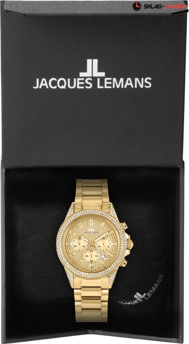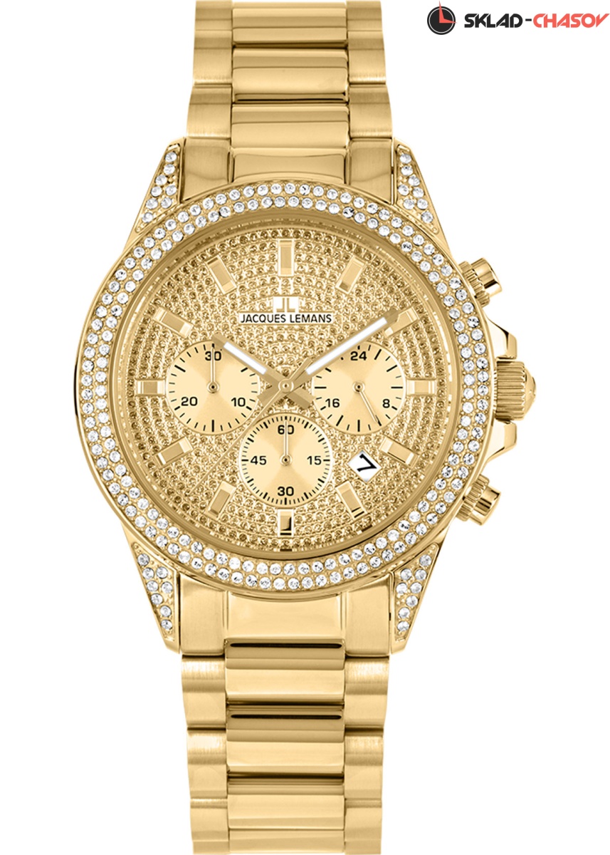 Роскошный хронограф с кварцевым механизмом в стиле sporty chic. Корпус диаметром 42 мм сделан из нержавеющей стали с PVD-покрытием из розового золота. Безель украшен двумя рядами сияющих кристаллов Swarovski. На золотистом циферблате, усыпанном кристаллами, размещены крупные полированные риски, индикатор, отображающий время в формате 24-х часов, минутный (до 30 минут) и секундный (до 60 секунд) накопители и апертура даты. В модели установлено ударопрочное минеральное стекло Crystex. Водостойкость равна 10 атмосфер. Браслет часов из стальных звеньев с PVD-прокрытием завершает надежная и удобная в использовании застежка-клипса с двумя боковыми кнопками. Эти часы — больше, чем просто аксессуар для определения времени. С их помощью любой образ станет незабываемым.