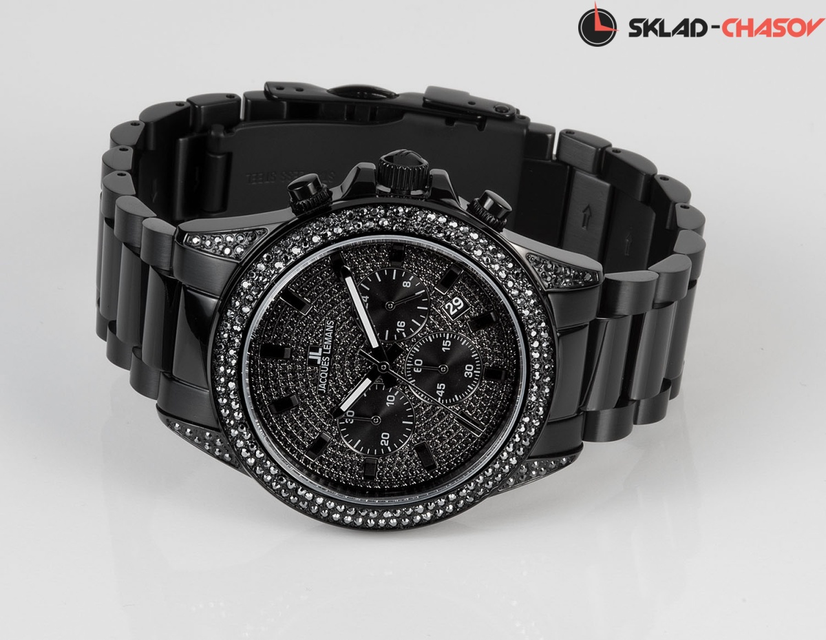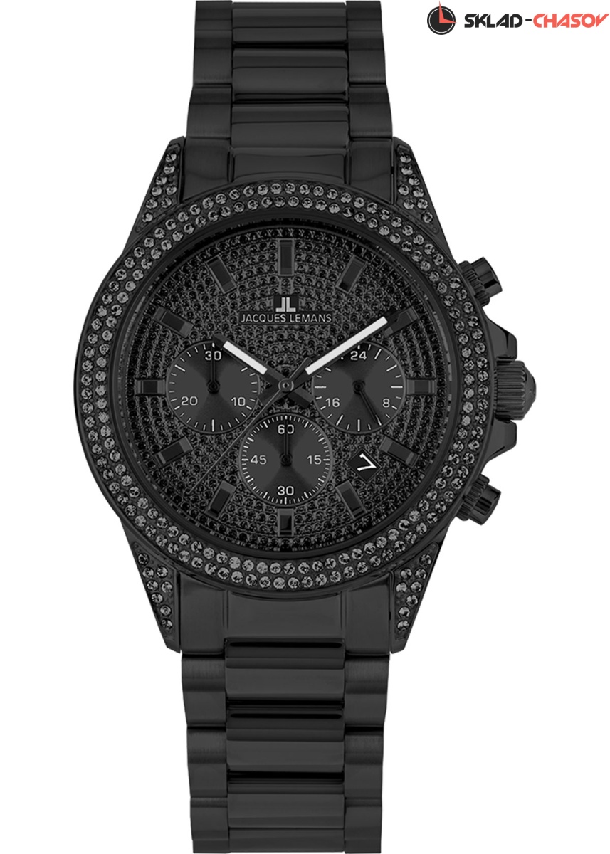 Роскошный хронограф с кварцевым механизмом в стиле sporty chic. Корпус диаметром 42 мм сделан из нержавеющей стали с PVD-покрытием черного цвета. Безель украшен двумя рядами сияющих кристаллов Swarovski. На черном циферблате, усыпанном кристаллами, размещены крупные полированные риски, индикатор, отображающий время в формате 24-х часов, минутный (до 30 минут) и секундный (до 60 секунд) накопители и апертура даты. В модели установлено ударопрочное минеральное стекло Crystex. Водостойкость равна 10 атмосфер. Браслет часов из стальных звеньев с PVD-прокрытием завершает надежная и удобная в использовании застежка-клипса с двумя боковыми кнопками. Эти часы — больше, чем просто аксессуар для определения времени. С их помощью любой образ станет незабываемым.