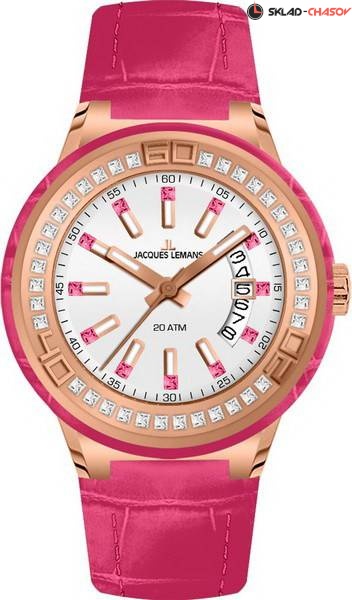 Часы Жак Леман из коллекции Miami яркая модель внушительного размера. Корпус диаметром 45 мм. Покрытие наносится современным методом ионного напыления, что гарантирует сохранение цвета и блеска. Безель украшен сверкающими кристаллами Swarovski и обрамлен кожаным кольцом. На циферблате расположены крупные люминесцентные риски и стрелки, указания часов дублированы кристаллами. Большая дата и минутная индикация служат для удобства использования. Часы оснащены кварцевым механизмом, ударопрочным стеклом Crystex и ремнем из натуральной кожи. Герметичность до 20 АТМ позволяет в часах плавать и нырять. Часы Жак Леман не оставят Вас без внимания.