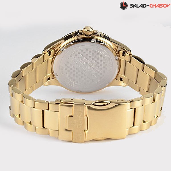 • Браслет с литыми звеньями из нерж. стали 316L, покрытие цвета золота, браслетная застежка с защитным фиксатором, раскладывающаяся при нажатии на кнопки.