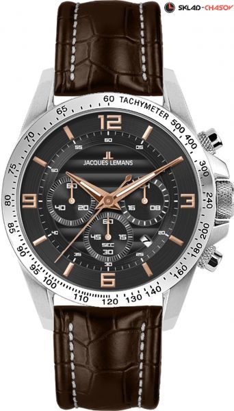 Привлекательный спортивный хронограф с высокоточным кварцевым механизмом. Его корпус диаметром 36 мм сделан из прочной нержавеющей стали. Объемный циферблат серого цвета мгновенно притягивает внимание: в центральной зоне размещены дополнительные индикаторы хронографа (24-х часовой индикатор, минутный и секундный накопитель) и окошко даты. Хорошо читаются риски и арабские цифры, на стрелки часов и минут нанесено люминесцентное покрытие, которое позволяет определить время даже в темноте. На безель вынесена отдельная тахиметрическая шкала. В модели установлено ударопрочное минеральное стекло Crystex. Стальная задняя крышка завинчивается, обеспечивая повышенную водостойкость 10 атмосфер. Темно коричневый ремешок со специальными эргономичными вставками и прошивкой выполнен из натуральной кожи. Эти часы станут надежным помощником тем, кто ценит активный образ жизни. Они дополнят как ежедневный образ, так и образ в спортивном стиле.