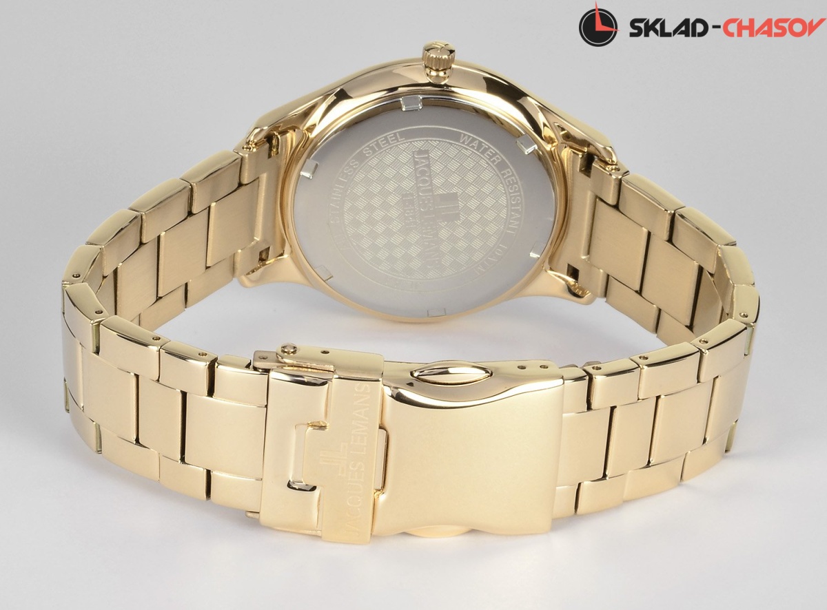 • Литой браслет из нерж. стали с IP-покрытием цвета золота, браслетная застежка с защитным фиксатором, раскладывающаяся при нажатии на кнопки.