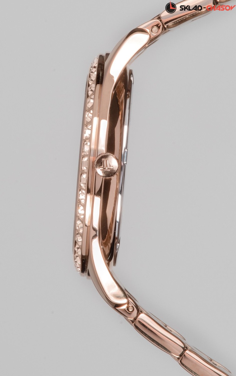 • Японский кварцевый механизм с аналоговой индикацией. • Точность хода с погрешностью не более -/+20 сек. в месяц. • Центральные часовая, минутная и секундная стрелки. • Корпус выполнен из нержавеющей стали 316L, поверхности с полировкой до зеркального блеска. • Диаметр корпуса составляет 37 мм. • Стойкое IP-покрытие цвета золота. • Фирменное минеральное стекло с покрытием Crystex с повышенной стойкостью к возникновению царапин. • Циферблат с инкрустацией кристаллами Swarovski или глянцевой поверхностью и аппликацией римских цифр и часовых меток. • Задняя крышка имеет винтовое соединение с корпусом. • Водостойкость 100 метров (10 АТМ).. • Литой браслет из нерж. стали с IP-покрытием цвета золота, браслетная застежка с защитным фиксатором, раскладывающаяся при нажатии на кнопки.