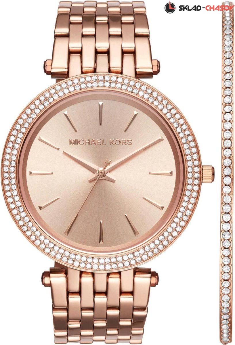 Комплект от Michael Kors: изящные женские наручные часы и утонченный браслет. Корпус часов и дополнительный браслет украшены кристаллами Swarovski. Гарантия 2 года.