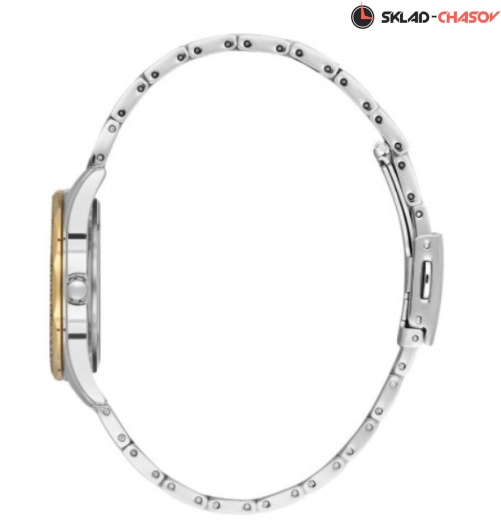 Циферблат часов выполнен с метками в виде штрихов. Безель украшен кристаллами.