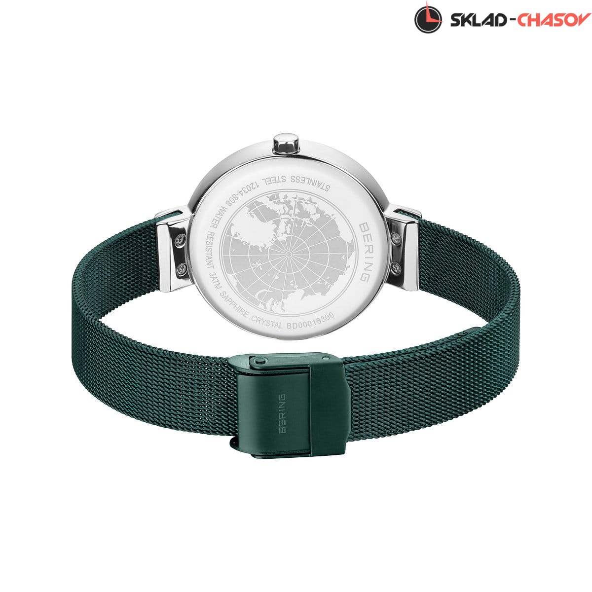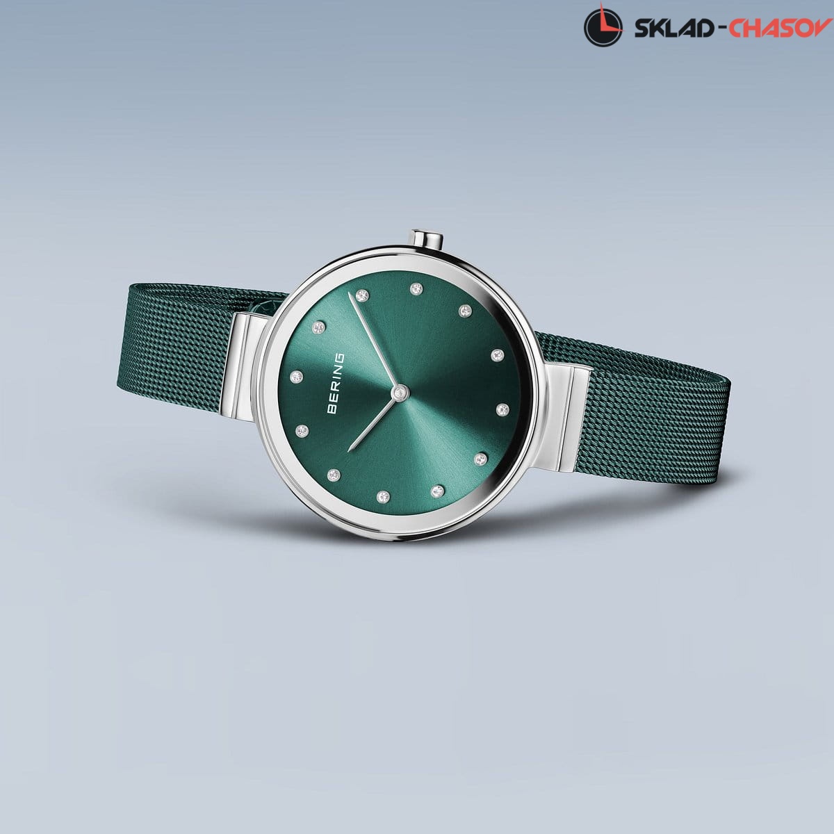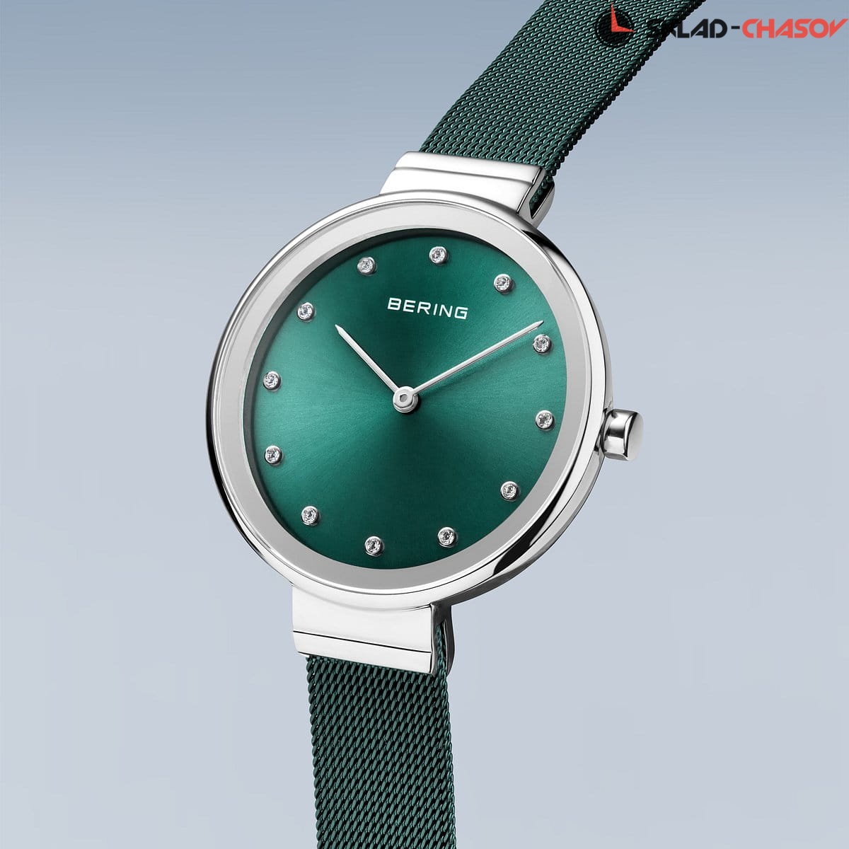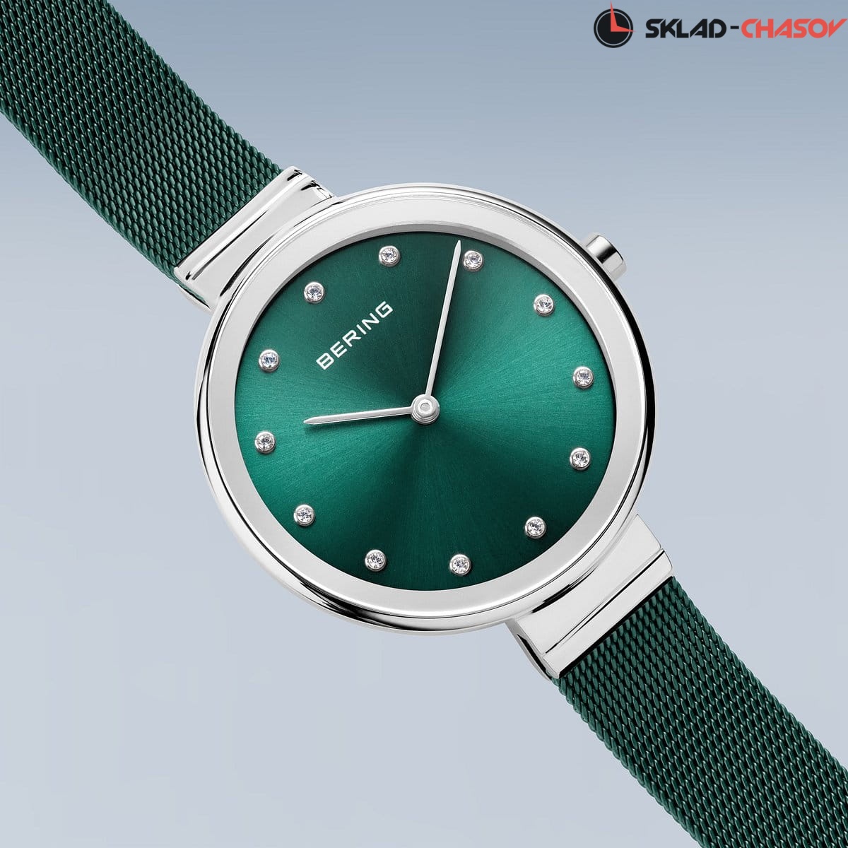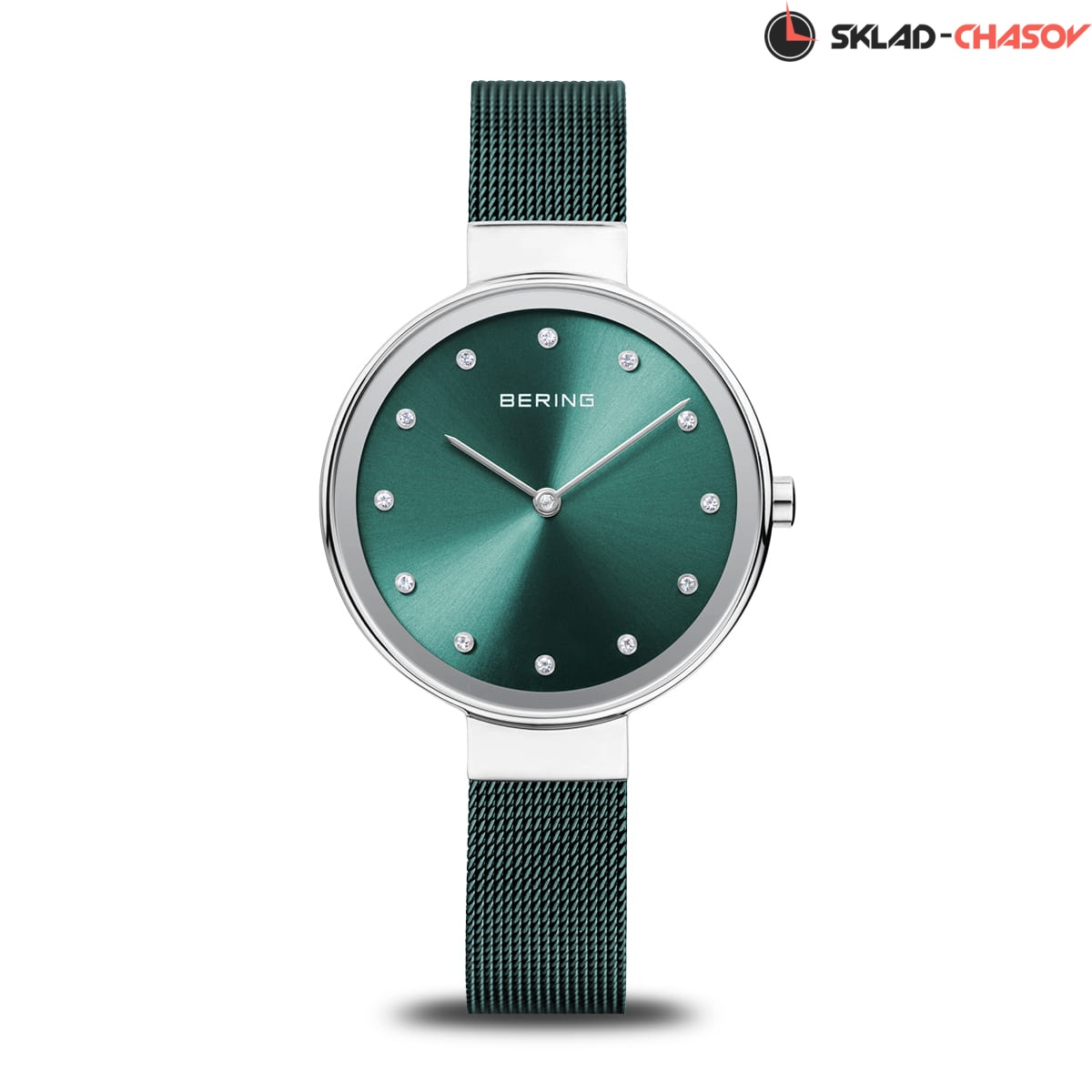 Зеленый циферблат с гильошированием в виде солнечных лучей и кристалами SWAROVSKI.