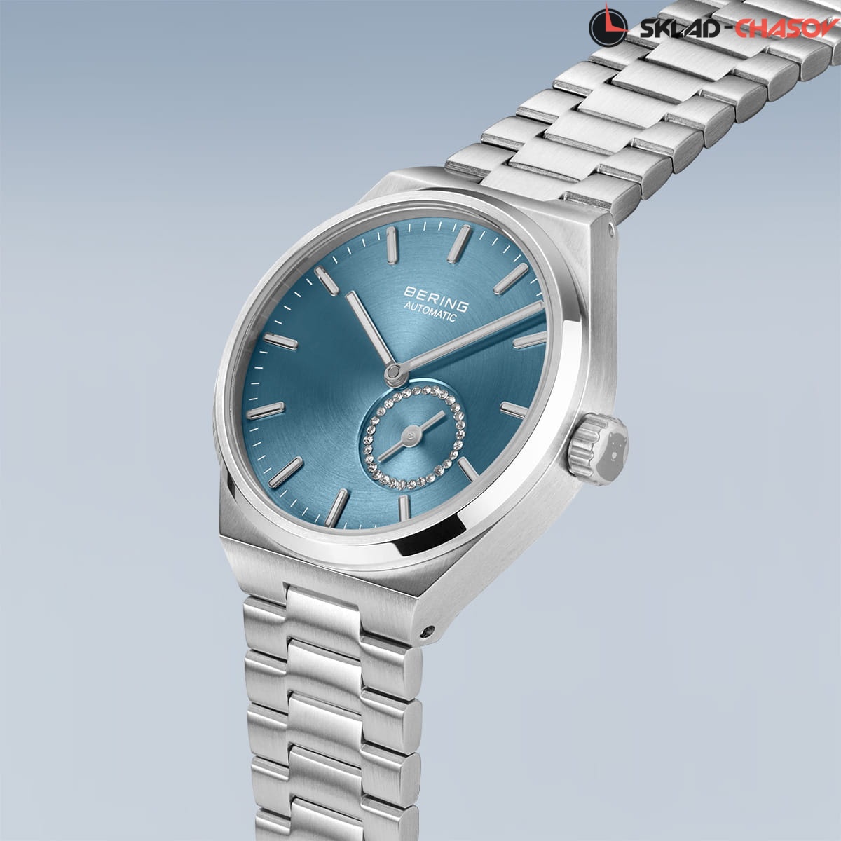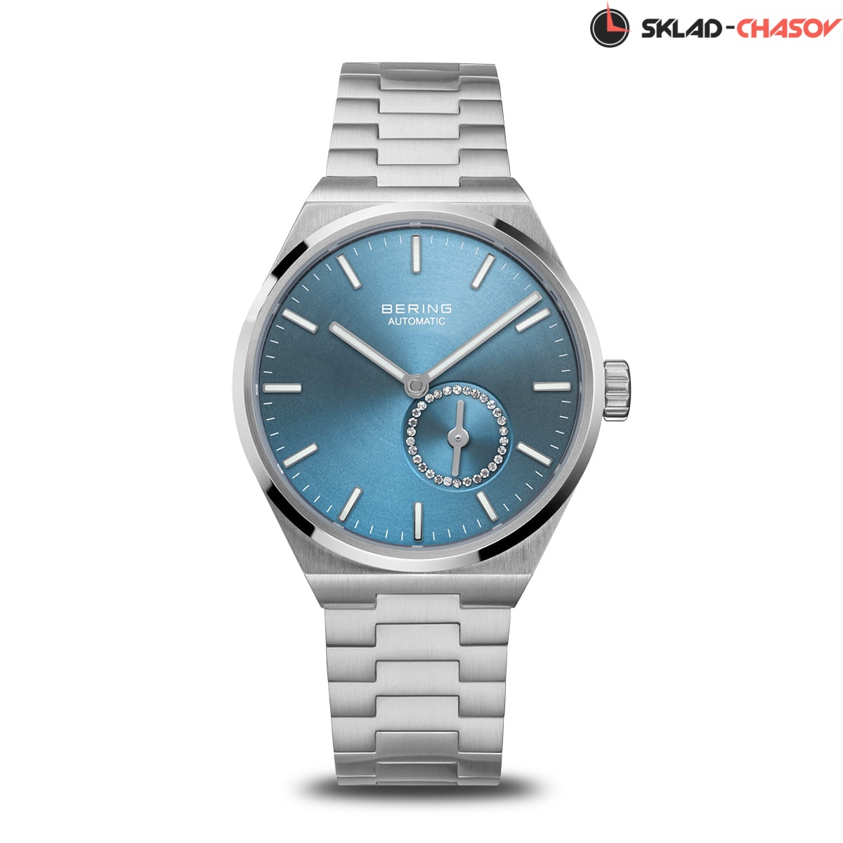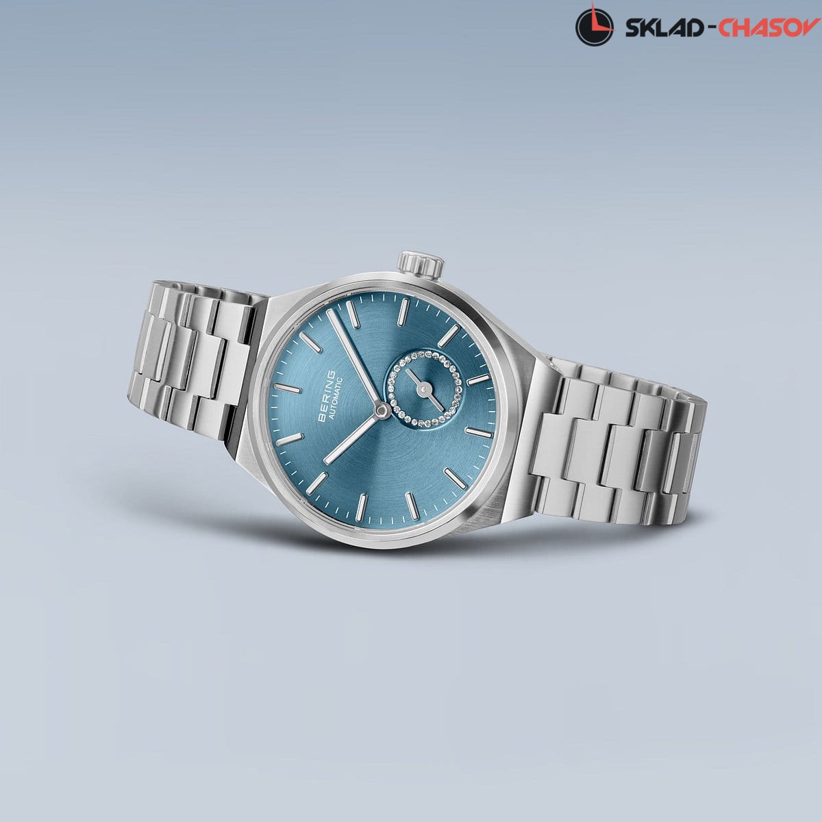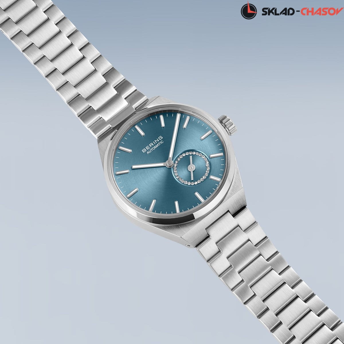Голубой циферблат с гильошированием в виде солнечных лучей. Циферблат секундной стрелки украшен фианитами.
