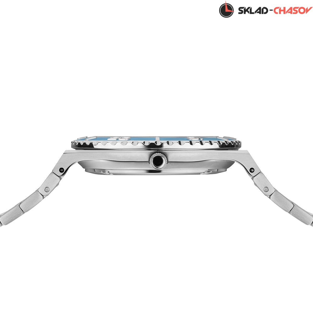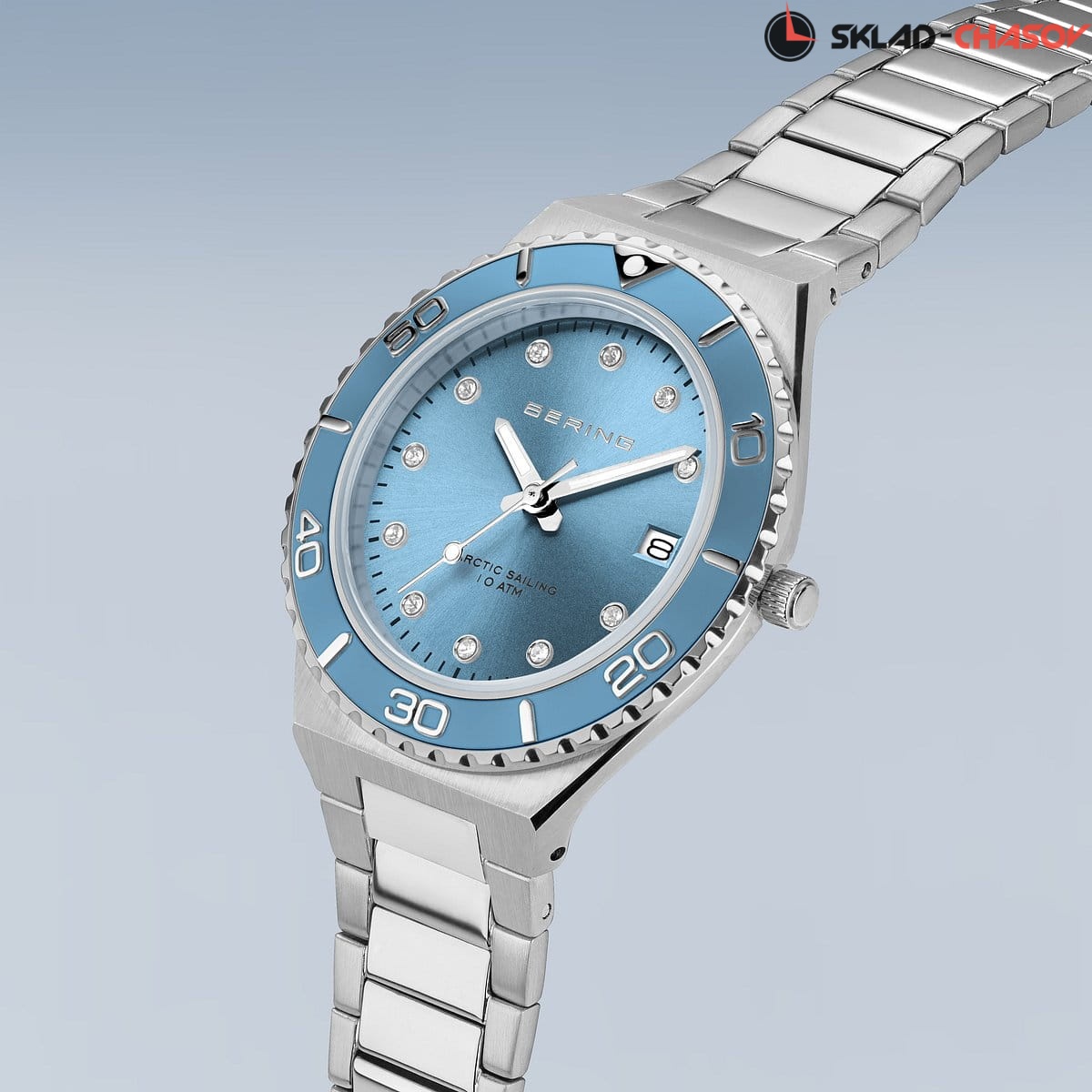 Голубой безель и циферблат с гильошированием в виде солнечных лучей и кристаллами.