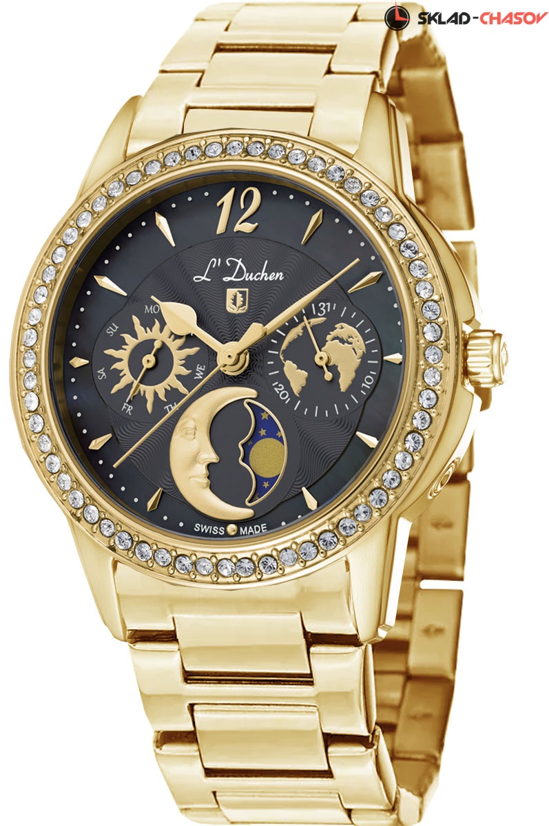 Почти невидимое, но стойкое к появлению царапин, сапфировое стекло позволяет любоваться главной изюминкой модели — роскошным циферблатом черного цвета. Центральная часть циферблата декорирована волнообразным гильоше. Индикатор дней недели представлен в виде солнечного диска, индикатор даты украшает изображение карты нашей планеты. Указатель лунных фаз элегантно выделен металлической рамкой и дополнен объемным элементом в виде месяца. И, конечно, неповторимость и уникальность часам придает кольцо из натурального перламутра по краю циферблата.
