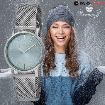 Циферблат: люминесцентные стрелки, накладные серебряные индексы, кристальная серебряная россыпь, дымчато-голубой