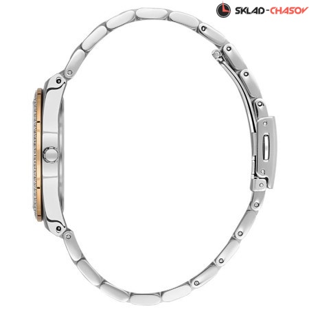 Циферблат выполнен с метками в виде штрихов. Безель украшен кристаллами.