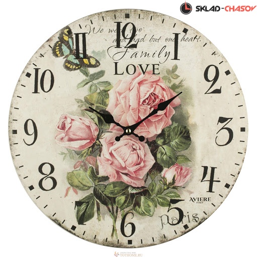 Настенные часы. Корпус изготовлен из МДФ. Циферблат отделан под «антик». Кварцевый механизм Young Town с плавным ходом.