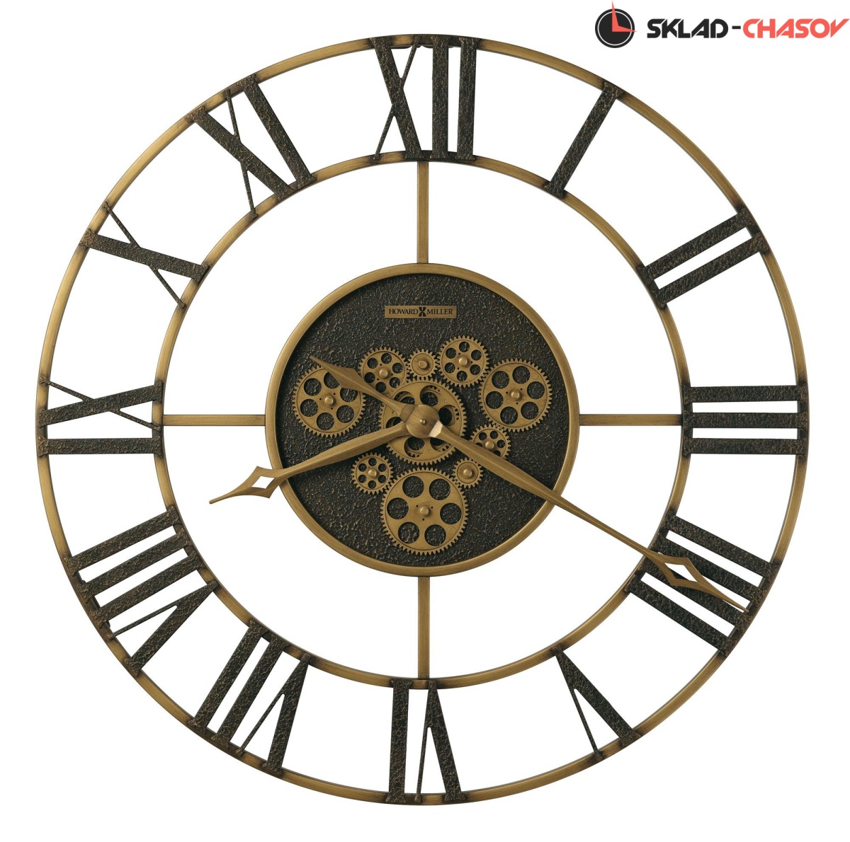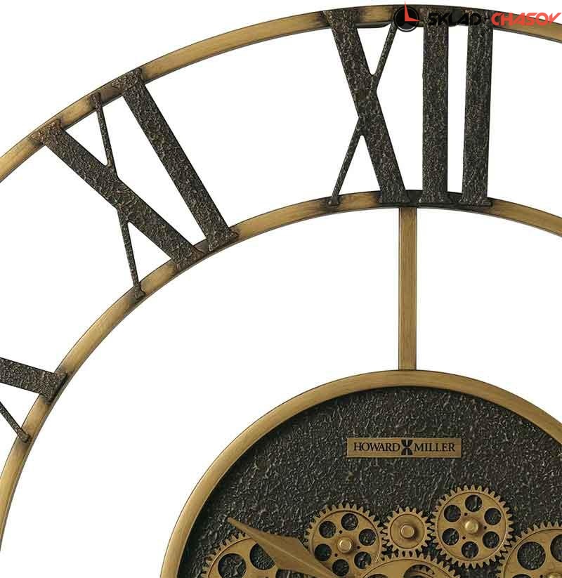 Эти большие галерейные часы выполнены из металла и тонированы в цвете состаренной меди. Отличительной особенностью модели являются объемные вращающиеся зубчатые колеса, расположенные в центре циферблата. Обрамляет блок с вращающимися колесами циферблат с римской оцифровкой. Металлические стрелки также тонированы в цвете состаренной меди.