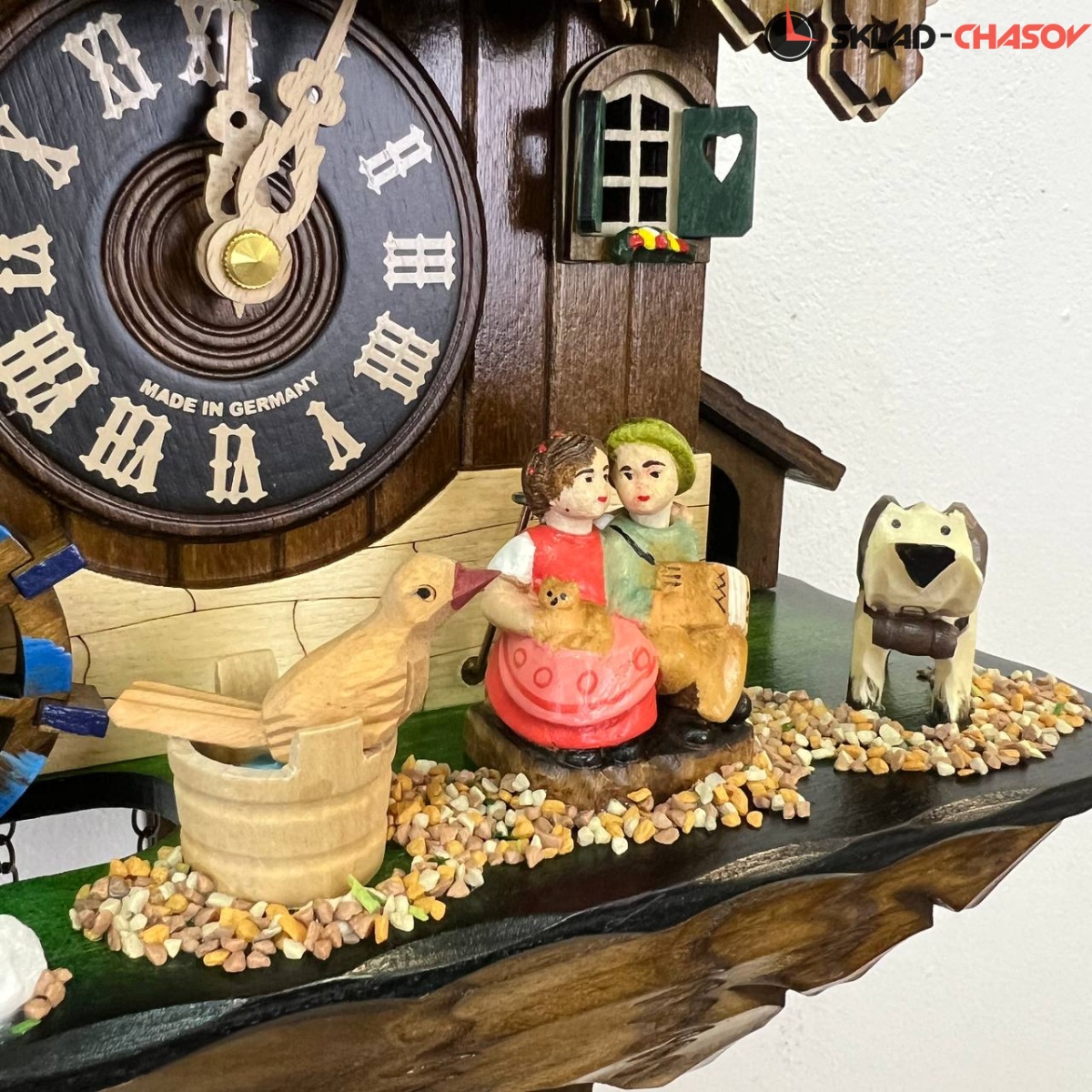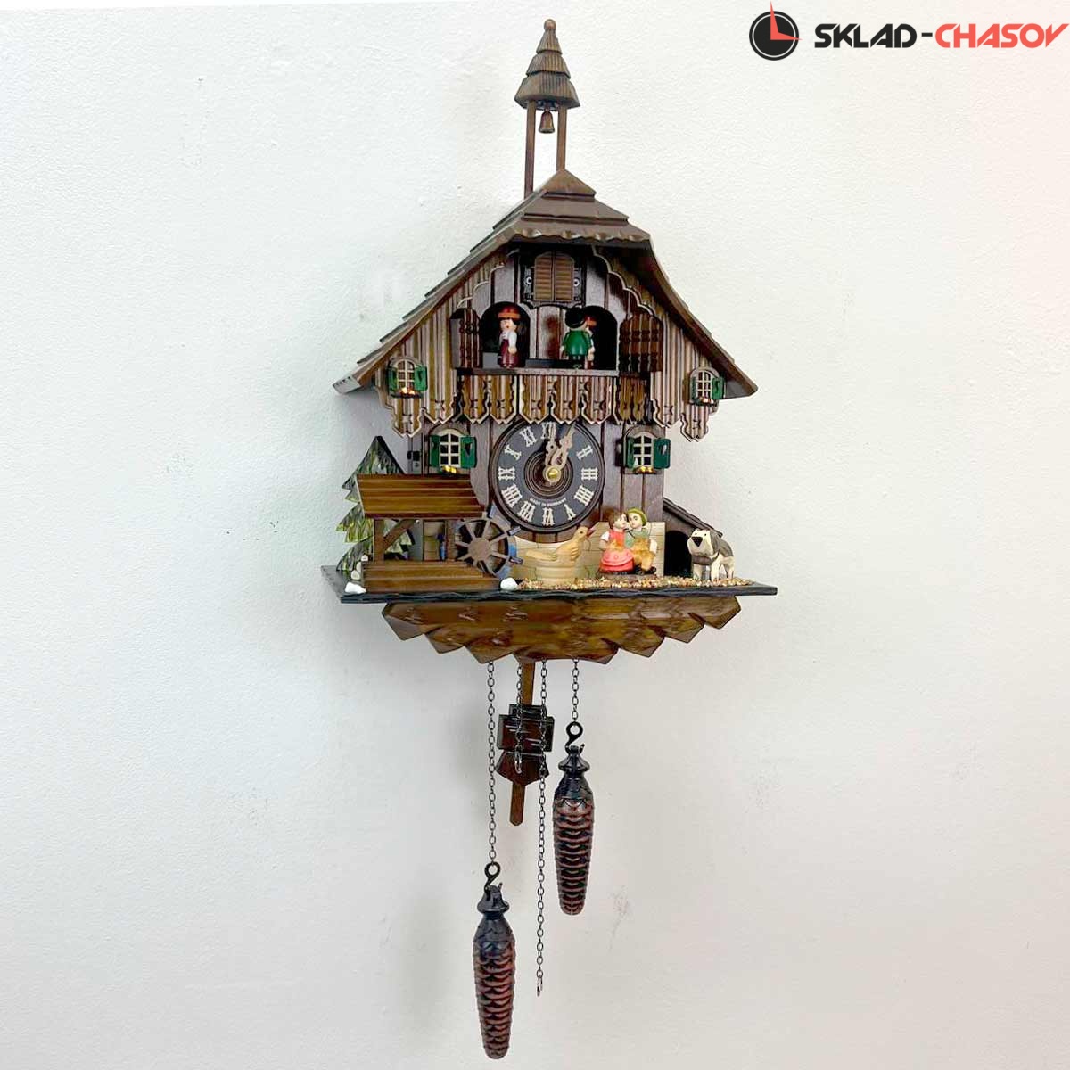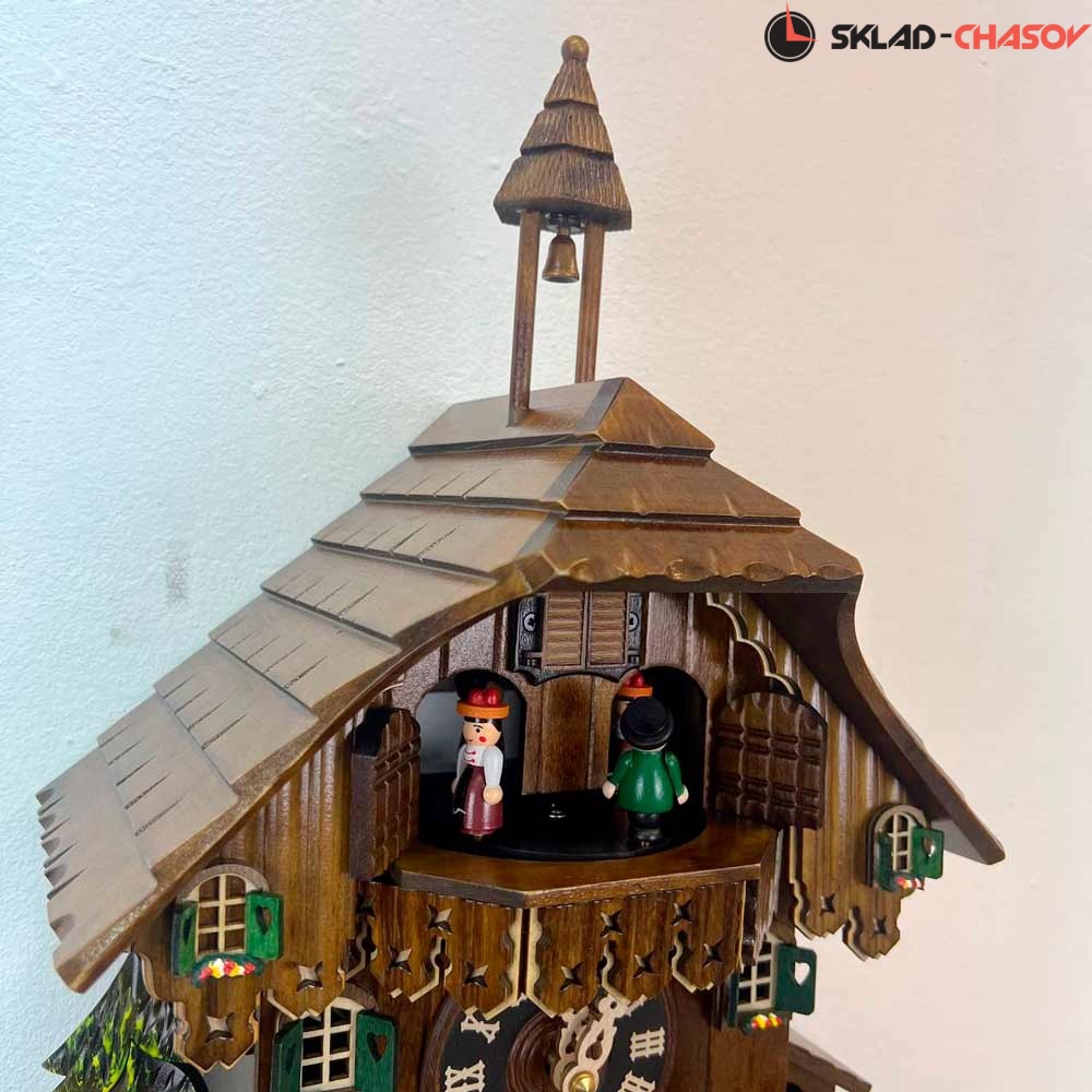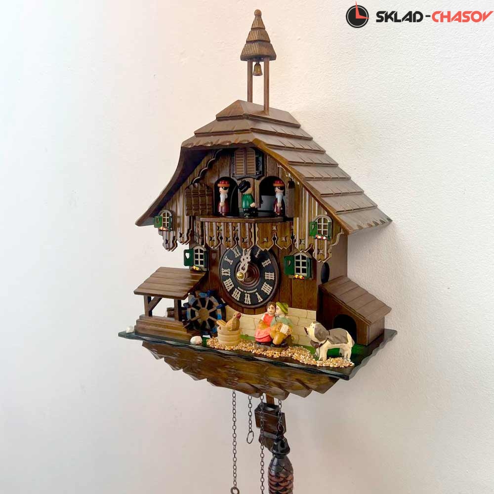 Часы с кукушкой SARS 04484-8MT (Германия) в виде домика с колокольней имеют надежный немецкий механизм и безупречное качество сборки и производства. Ручная роспись часов придает некий домашний стиль. Часы с изображением на фасаде домика елочек, скамейки с детьми и движущейся водяной мельницы.