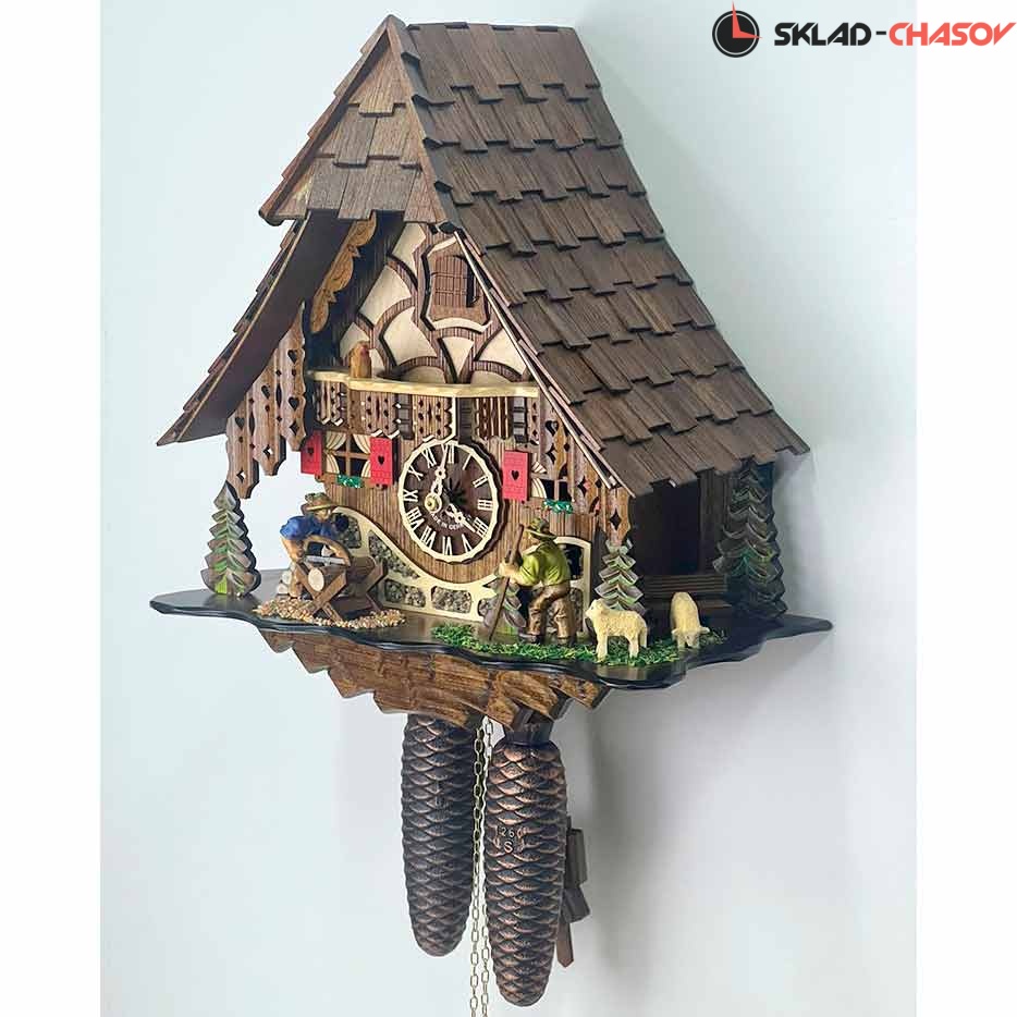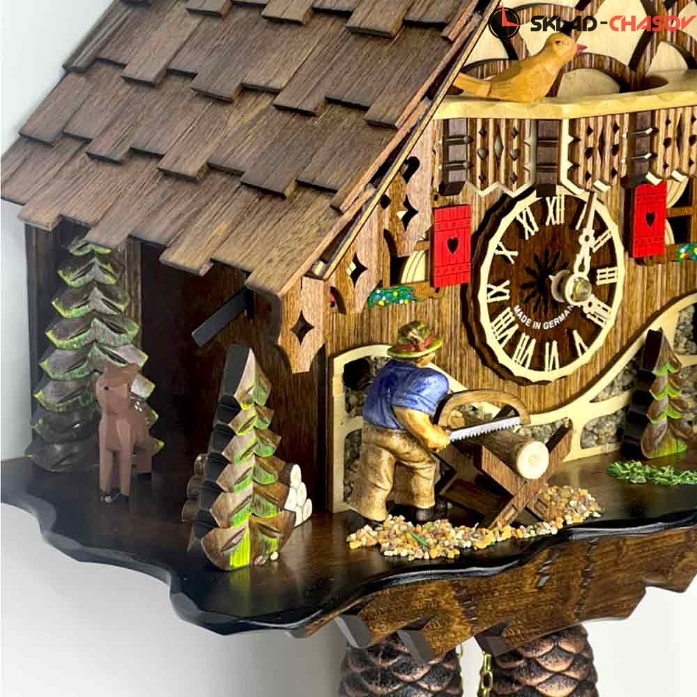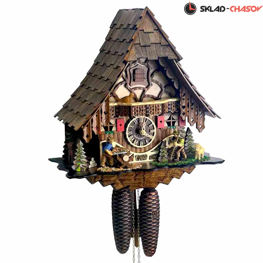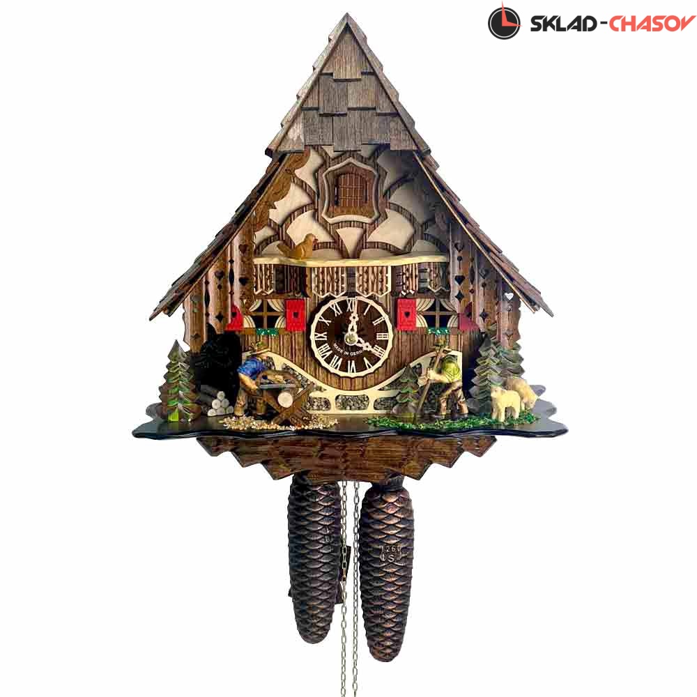 Часы механические с кукушкой SARS 46619/8-90 (Германия) имеют надежный немецкий механизм и безупречное качество сборки и производства. Фасад часов украшает птица наверху на балконе,а также дровосек и человек с пилой, которые двигаются во время кукования. По бокам композиции находятся елочки и барашек.