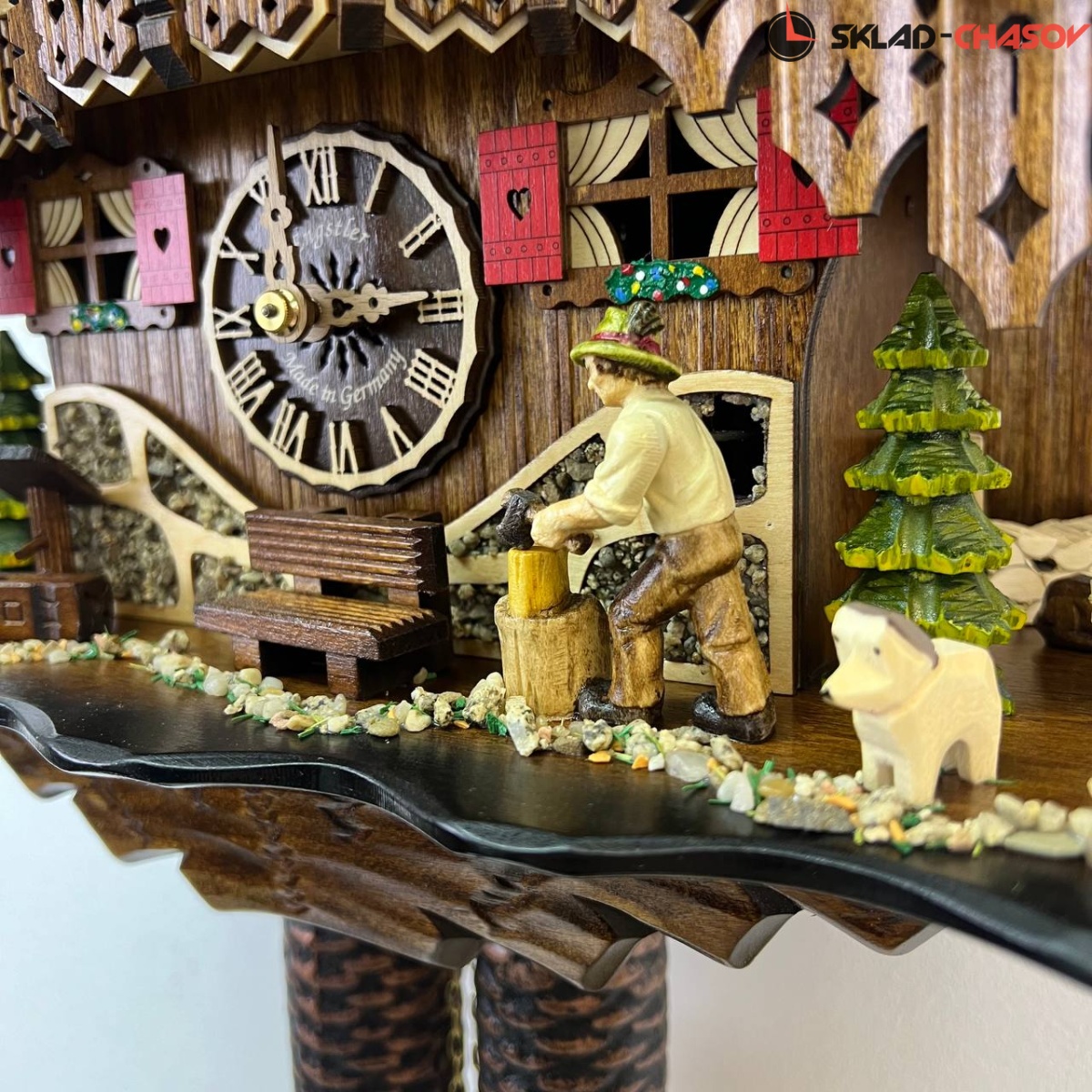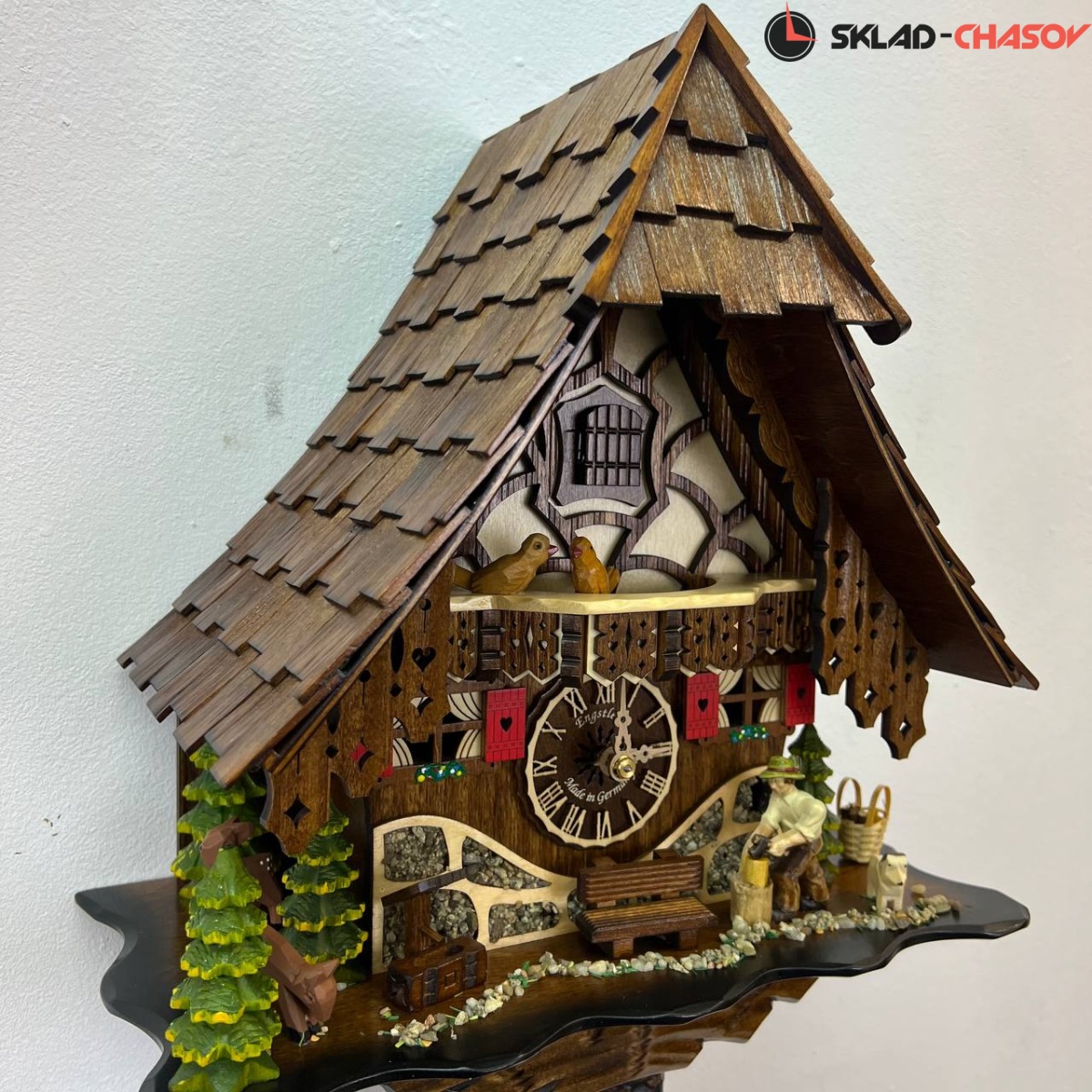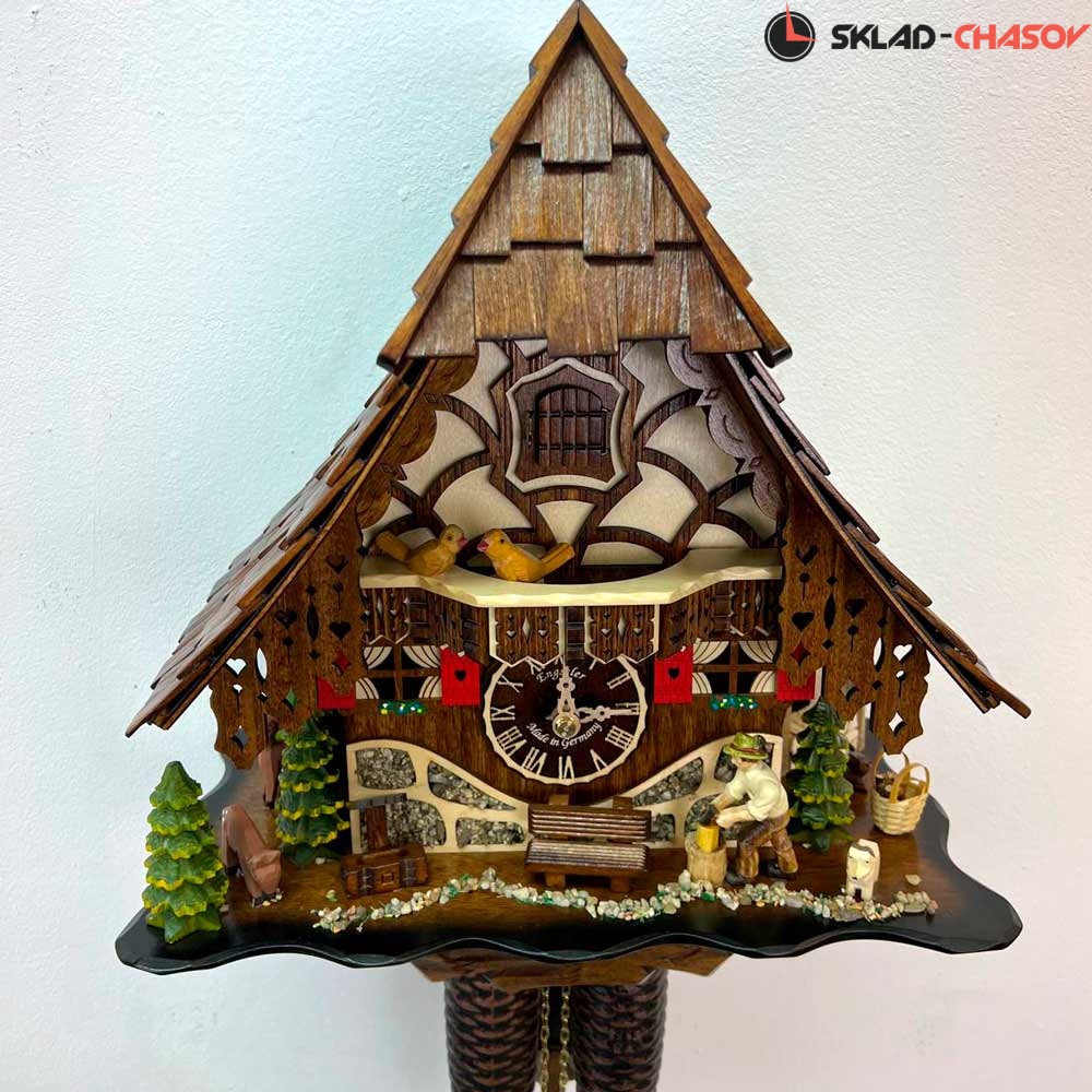 Часы механические с кукушкой SARS 46619/8-90 (Германия) имеют надежный немецкий механизм и безупречное качество сборки и производства. Фасад часов украшает птица наверху на балконе,а также дровосек и человек с пилой, которые двигаются во время кукования. По бокам композиции находятся елочки и барашек.