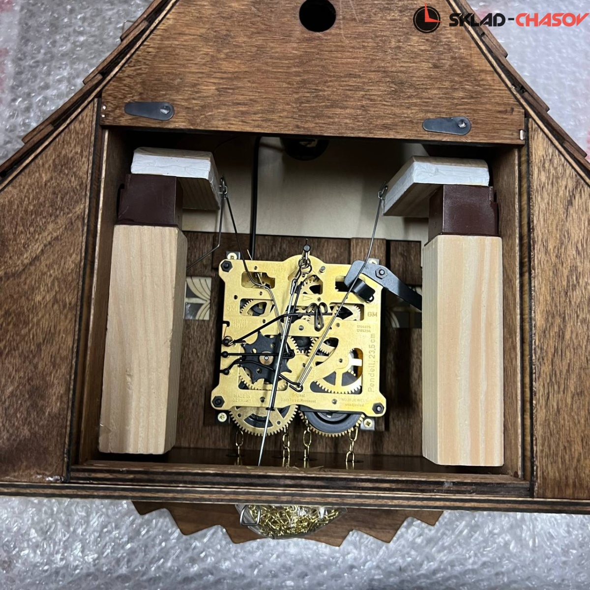 Кукушка срабатывает каждый час. Механизм: механика. Завод на 8 дней. Подвижные фигурки. Ручное отключение. Размер: 37*30*20см. Высота без учета шишек: 37 см. Высота с маятником 53 см. Циферблат 7 см. Корпус: дерево.
