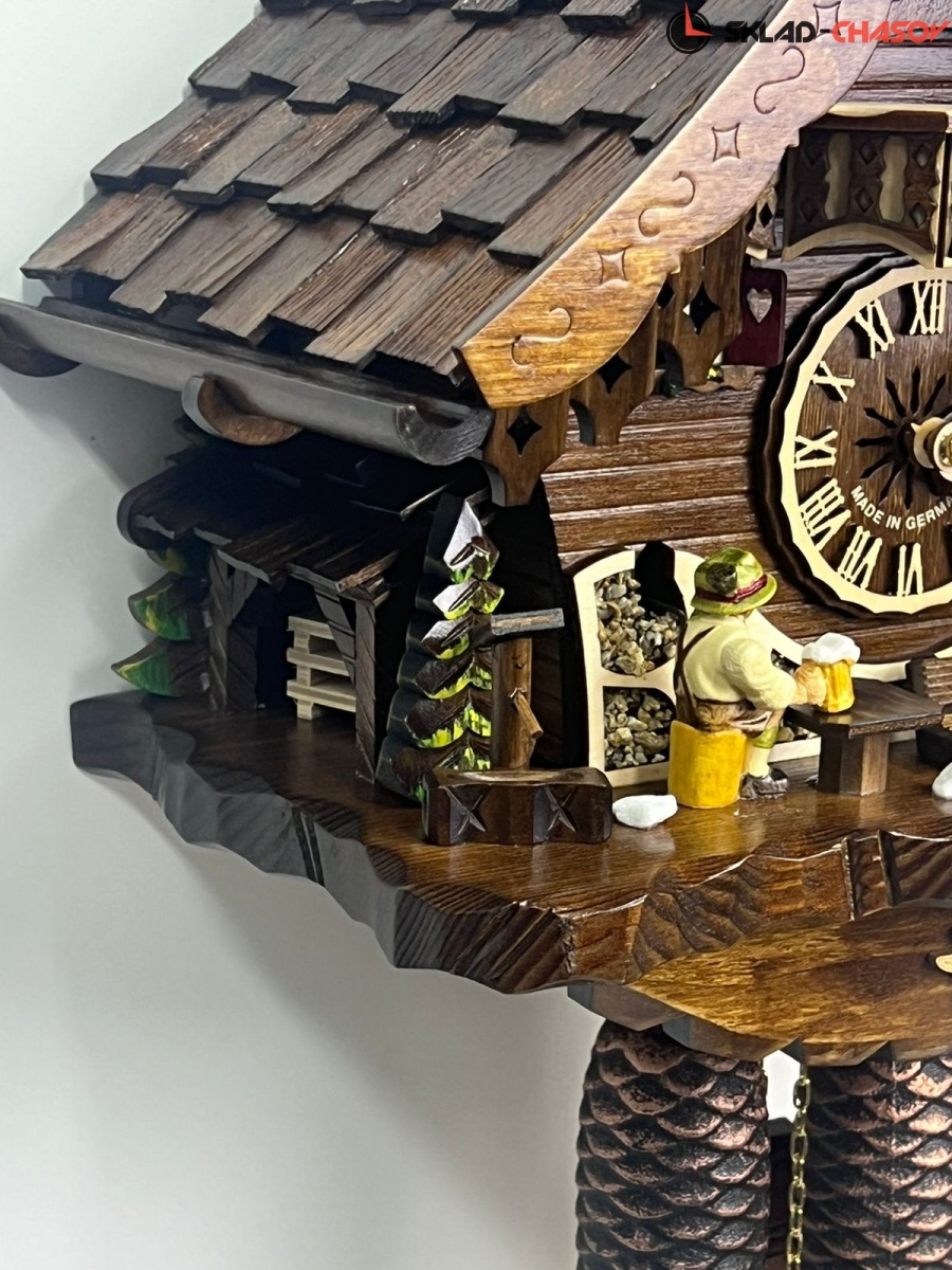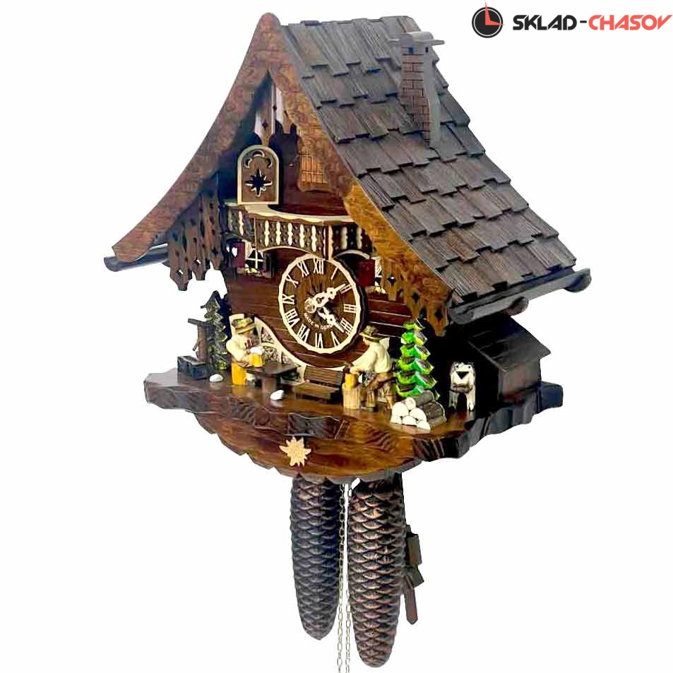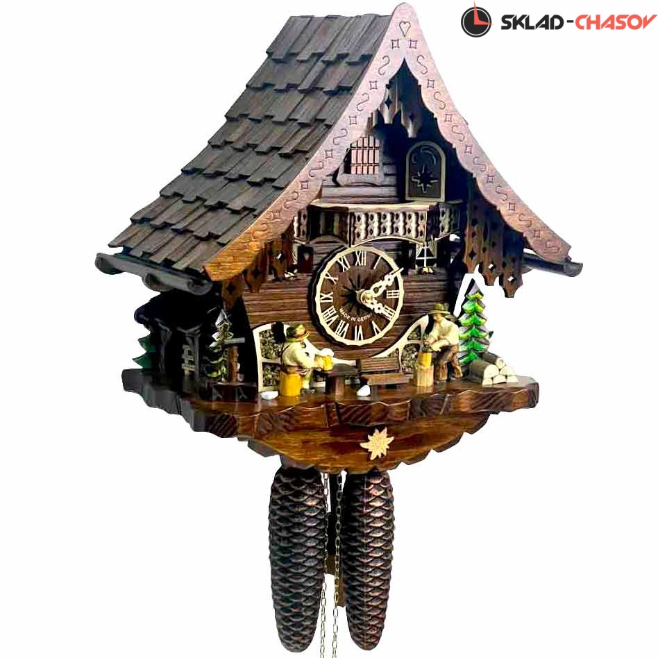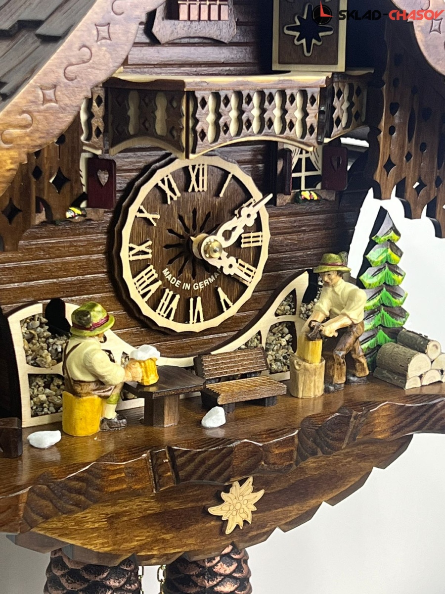 Часы механические с кукушкой SARS 47916/8-90 (Германия) имеют надежный немецкий механизм с заводом 8 дней и безупречное качество сборки и производства. Фасад часов украшает дровосек и человек с кружкой пива, которые двигаются во время кукования. По бокам композиции находятся елочки, собака и водяная колона.