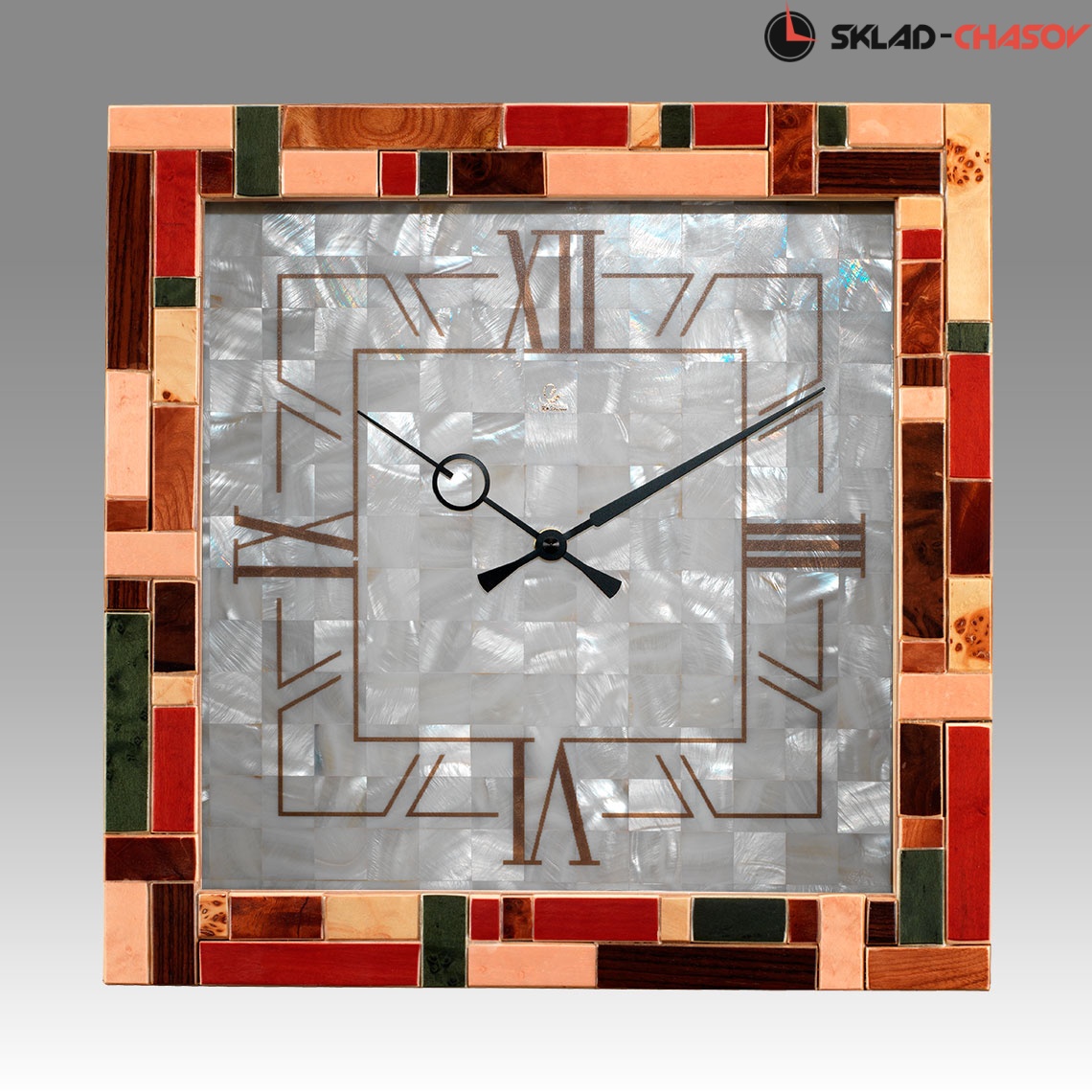 Мозаичные настенные часы с фигурной отделкой из цветного дерева.