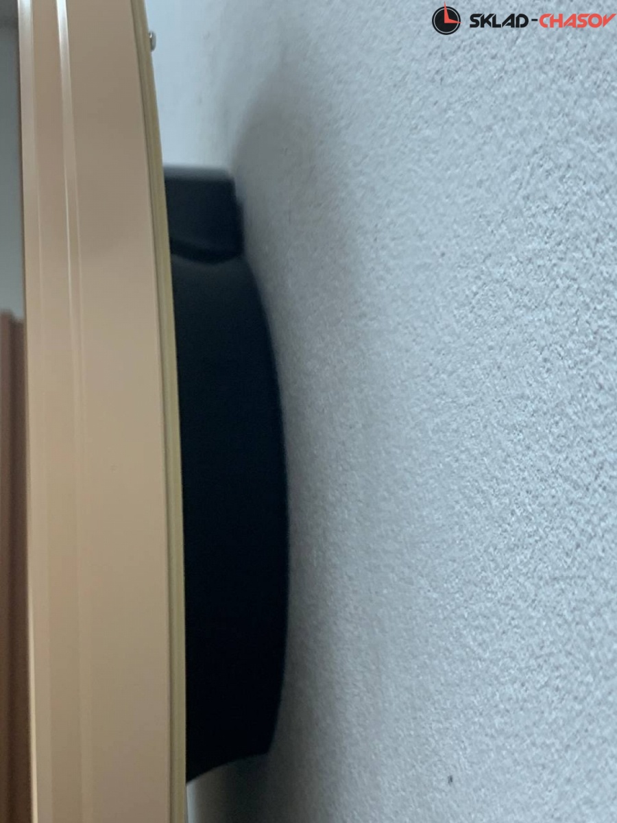 Циферблат светло-коричневого цвета, украшен растительными узорами в виде деревянной мозаики.