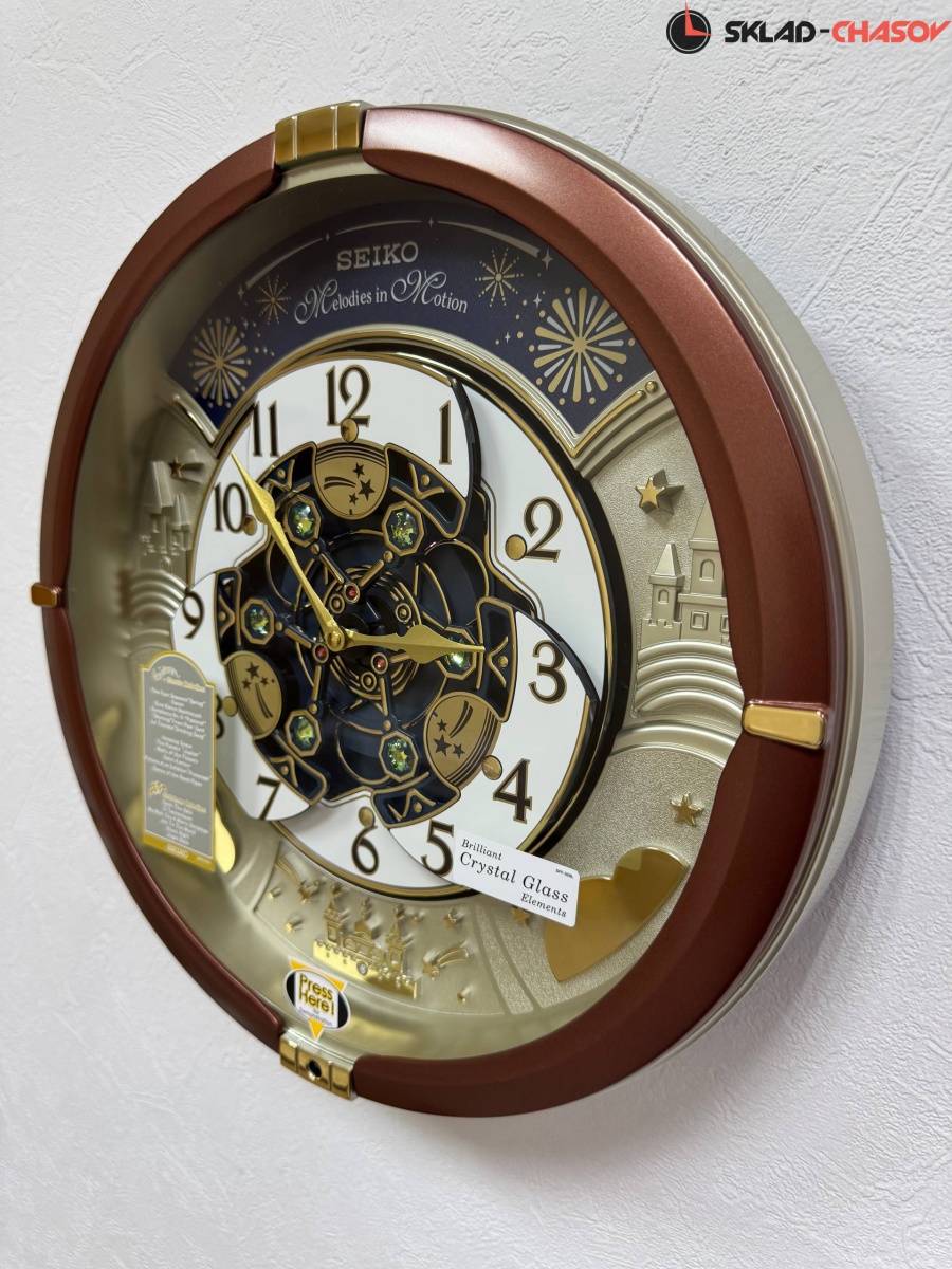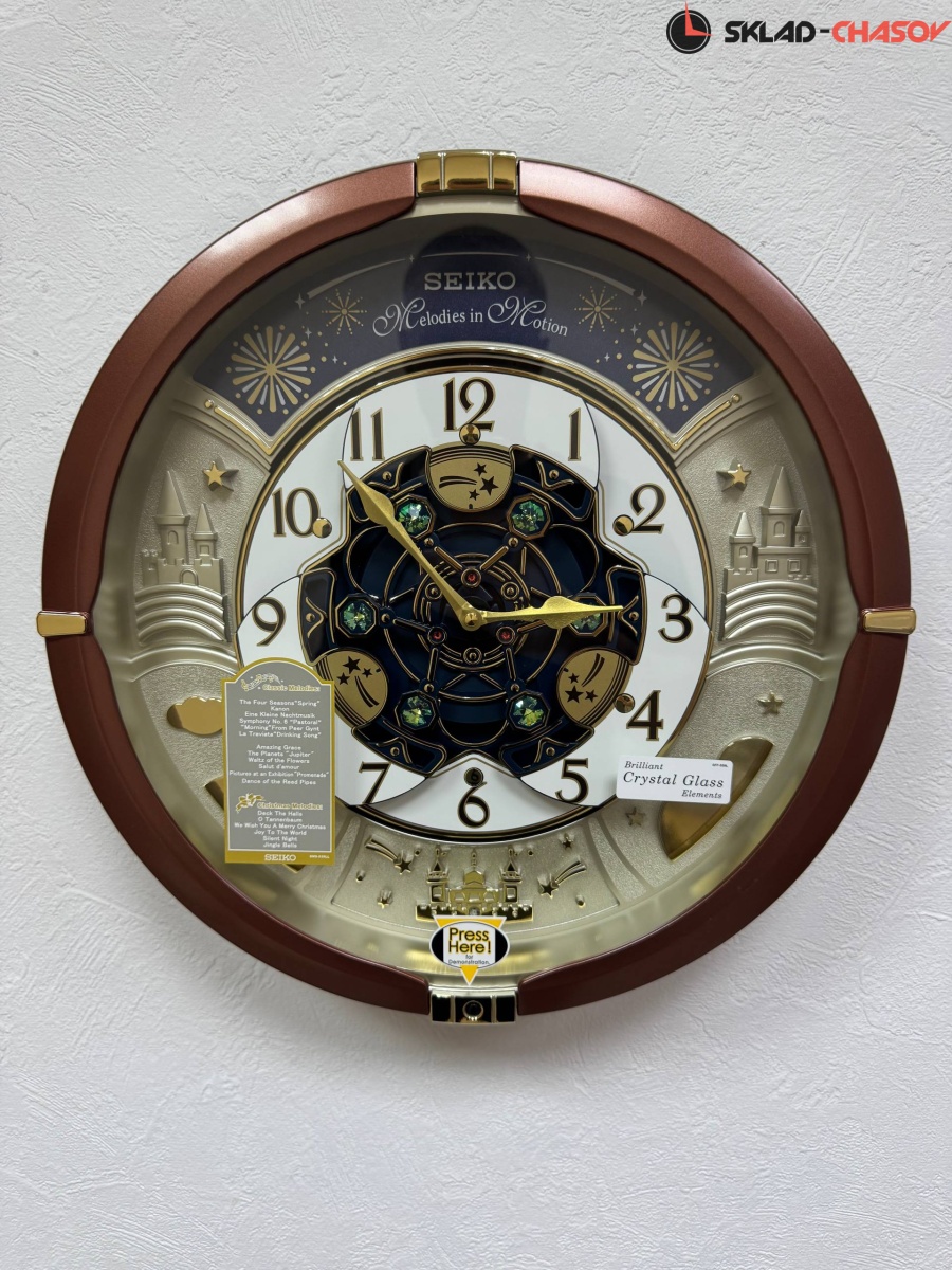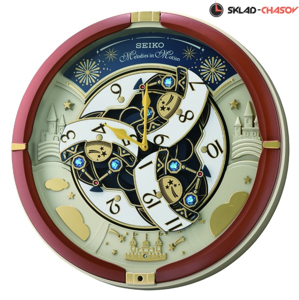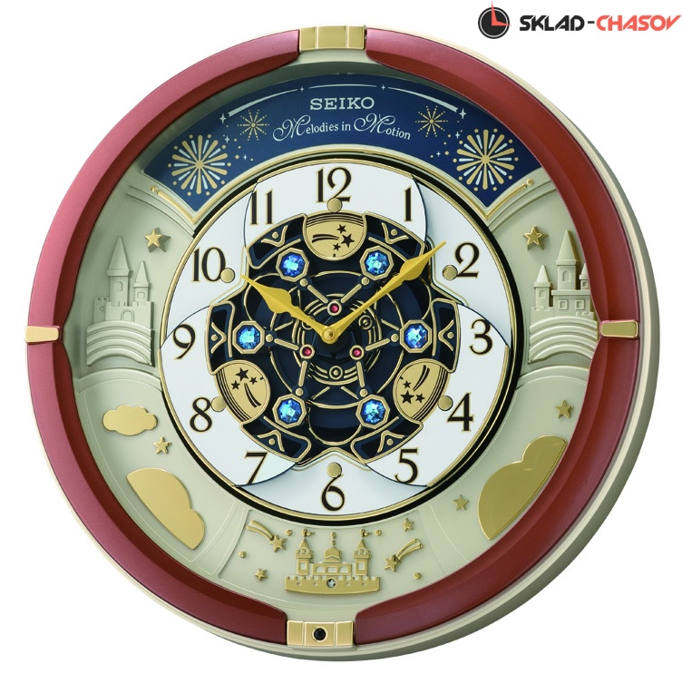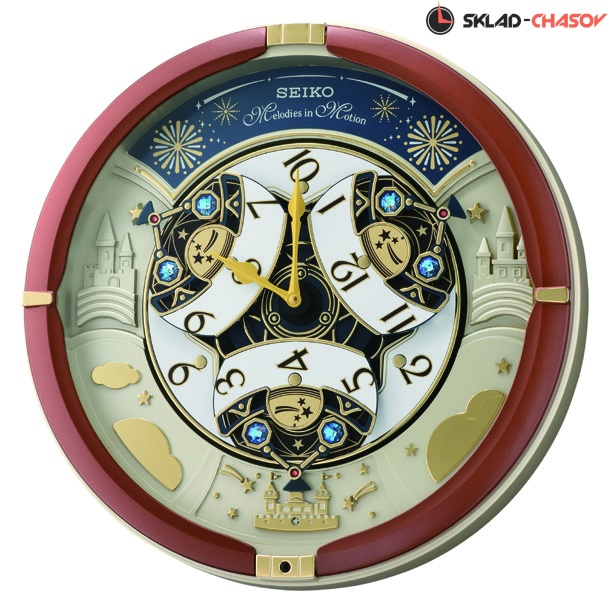 Настенные часы с вращающимися деталями циферблата. Режим демонстрации включается нажатием кнопки в нижней части корпуса, 18 классических и рождественских мелодий, датчик освещенности. Требуется 4 батарейки С (в комплекте).