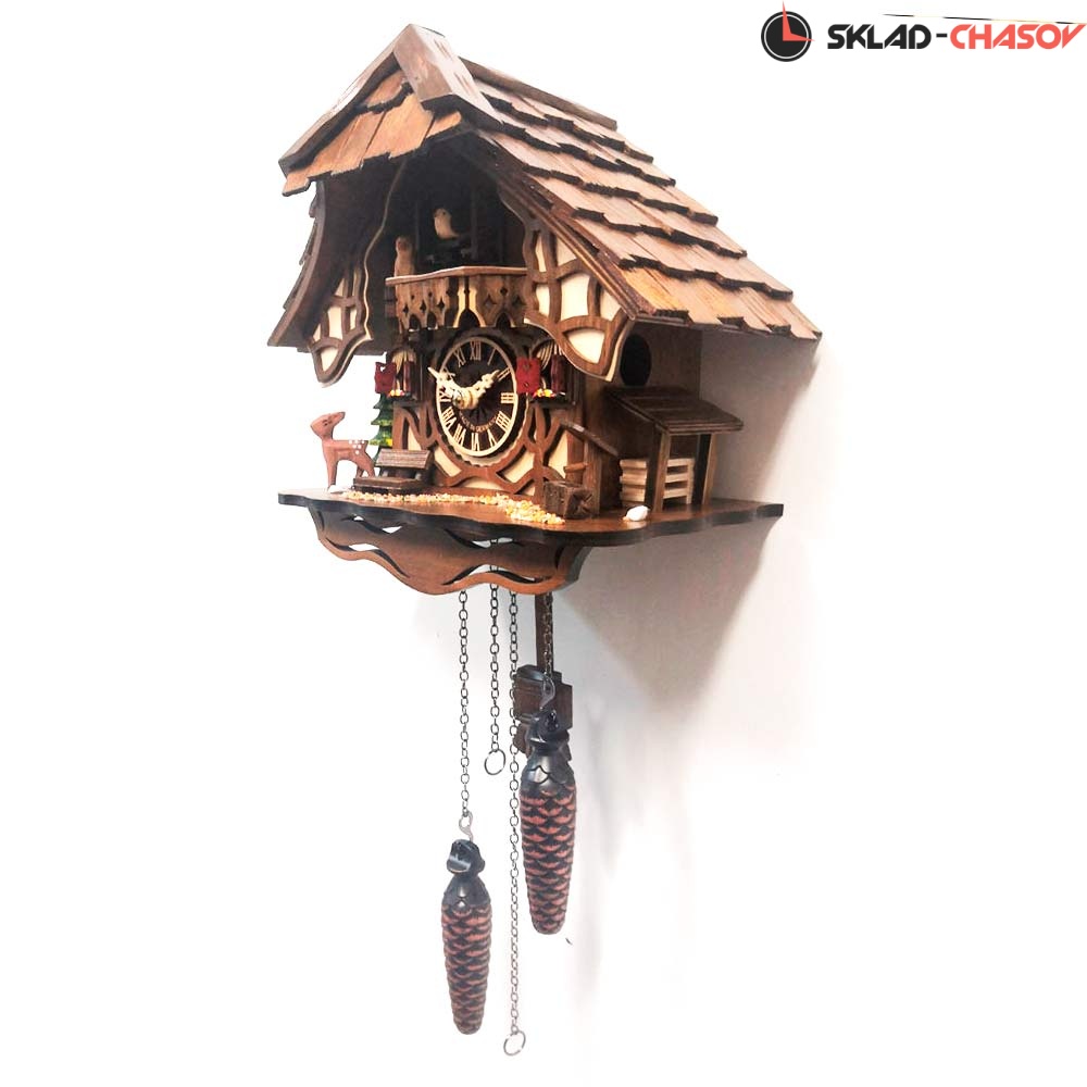 Кукушка срабатывает каждый час и играет мелодия. Статичные резные фигурки, 12 разных мелодий. Механизм: кварцевый. Размер: 25x20x14 см. Высота без учета шишек: 25 см, Корпус: дерево. Батарейки: тип С -3 шт в комплект не входят.