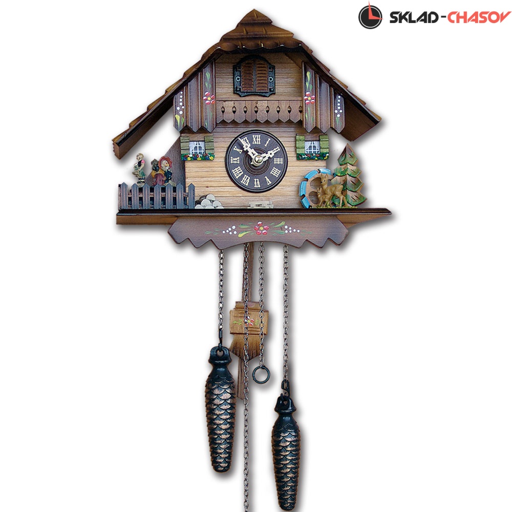 Кукушка срабатывает каждый час и играет мелодия. Подвижные фигурки, Механизм: кварцевый. Размер: 26*22,5*15 см. Высота без учета шишек: 26 см, Корпус: дерево. Батарейки: тип С -3 шт в комплект не входят.