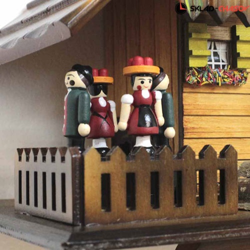 Оригинальность этих часов подчеркивают вращающиеся по кругу фигурки, которые двигаются при срабатывании кукушки.
