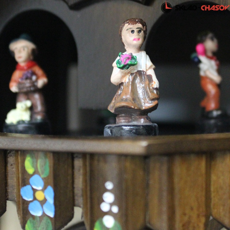 Кукушка срабатывает каждый час и играет мелодия. Подвижные фигурки. Механизм: кварцевый (Германия). Размер: 31x28x18 cм, высота 31 см. Ночной режим- ручной и Светодиод. Корпус: дерево.