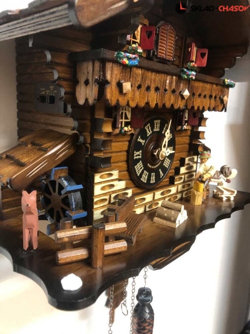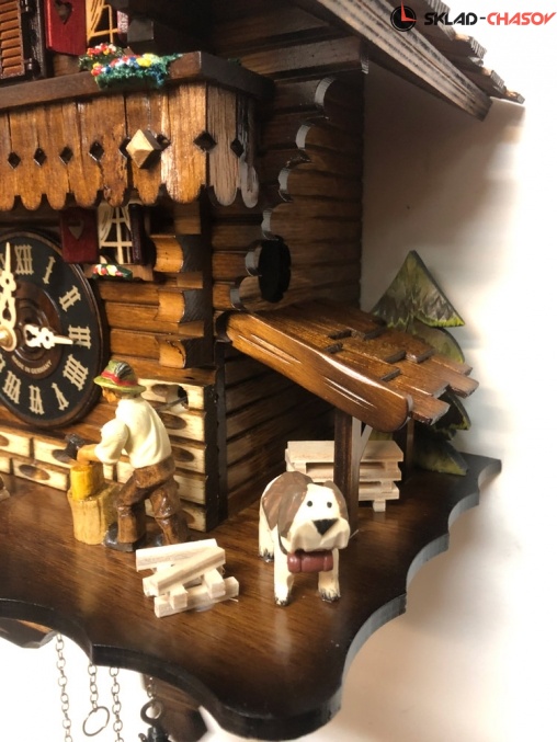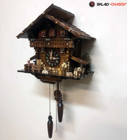 Кукушка срабатывает каждый час и играет мелодия. Движущиеся фигуры- дровосек рубит дрова, водяное колесо сбоку крутится. Механизм: кварцевый (Германия). Размер: 31x28x18 cм, высота 31 см. Ночной режим. Корпус: дерево. Цвет: темный орех. Батарейки: тип С -3 шт в комплект не входят.