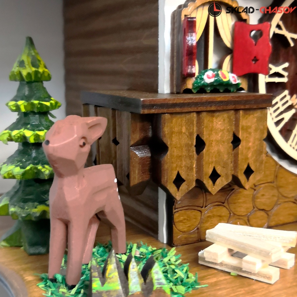 - Корпус выполнен из натурального дерева, собран очень качественно опытными мастерами своего дела, декорирован резными элементами тонкой ручной работы и украшен ручной росписью. Модель с фигуркой олененка, елочки, маленькой собачки.