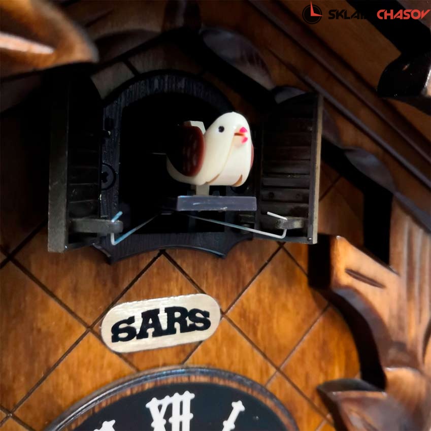 Часы с кукушкой SARS 0532-8M (Германия) имеют надежный немецкий механизм и безупречное качество сборки и производства. Фасад часов украшает птица сверху, а по бокам листья. Ручная роспись элементов часов.