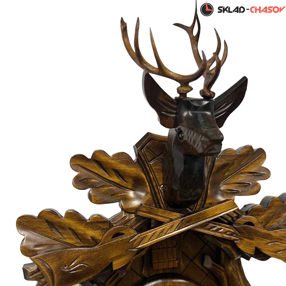 Фасад часов украшают голова оленя и ружья наверху и по бокам подстреленные животные, снизу сумка охотника.