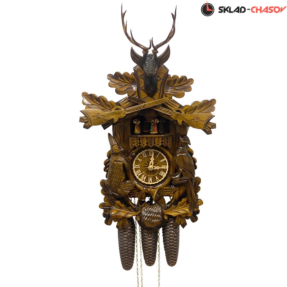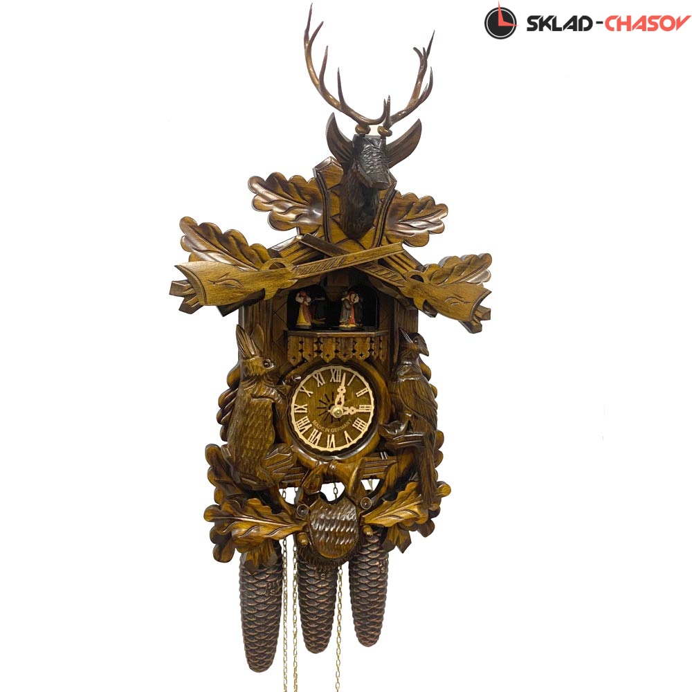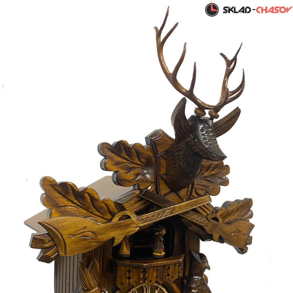 Часы с кукушкой SARS 0739/8-90MT (Германия) имеют надежный механический немецкий механизм и безупречное качество сборки и производства. Филигранная резьба на тему охоты. Фасад украшен резными атрибутами, трофеями охотника.