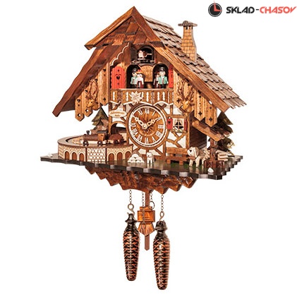 - Оригинальность этих настенных часов с кукушкой SARS подчеркивают вращающиеся при срабатывании кукушки фигурки- двигаются фигурки сверху, поезд выезжает из тунеля, а также стоят собачки без движения.