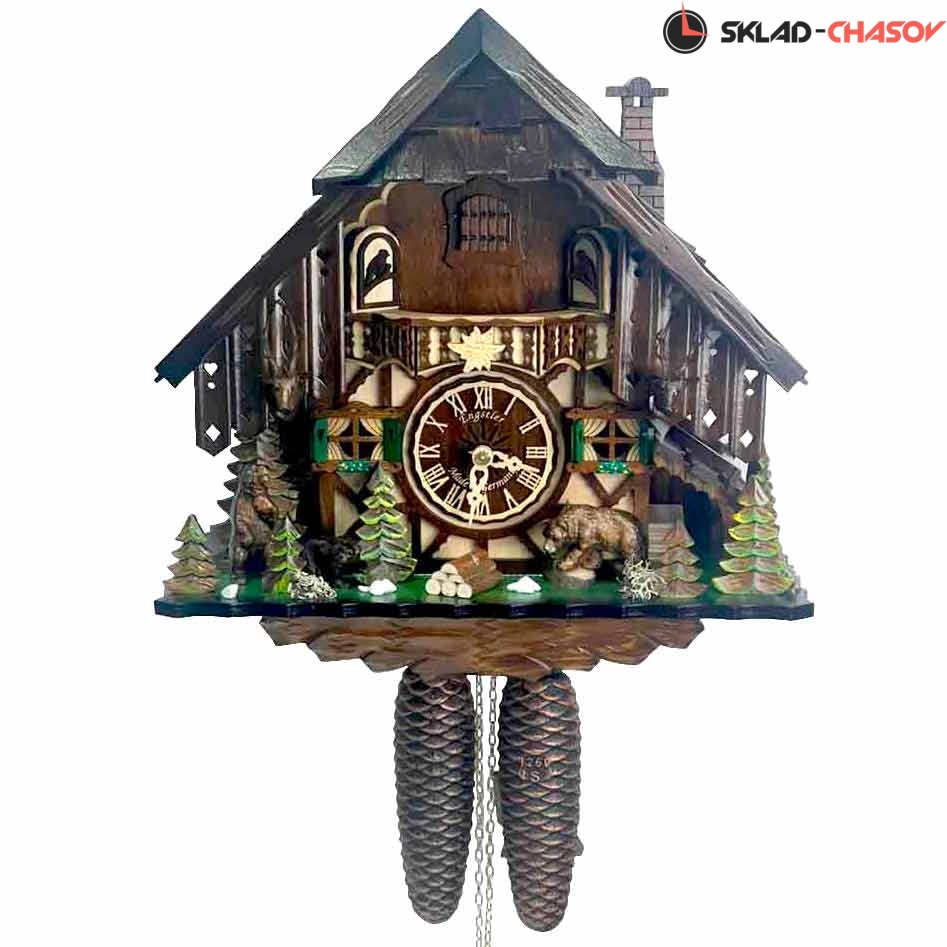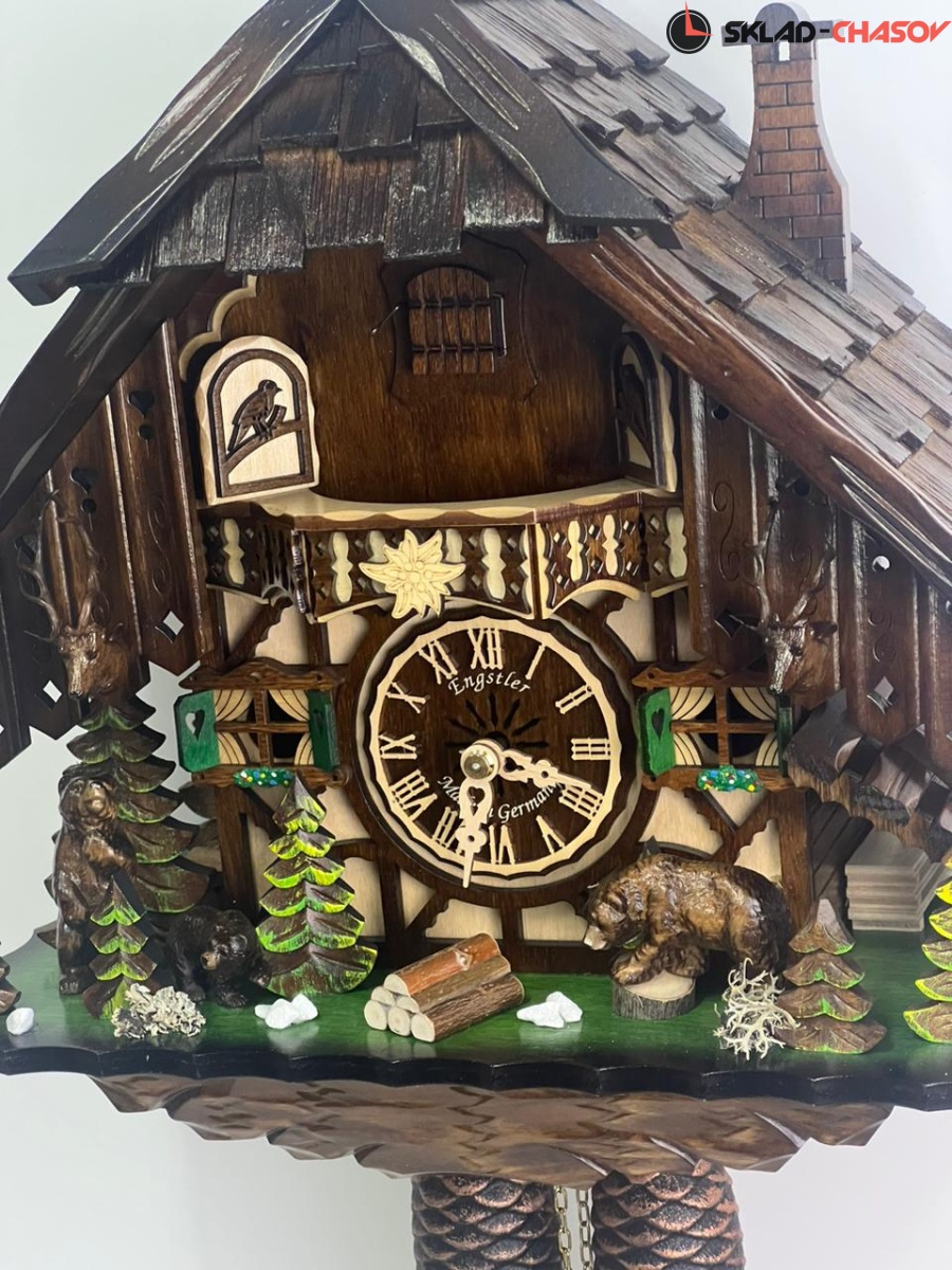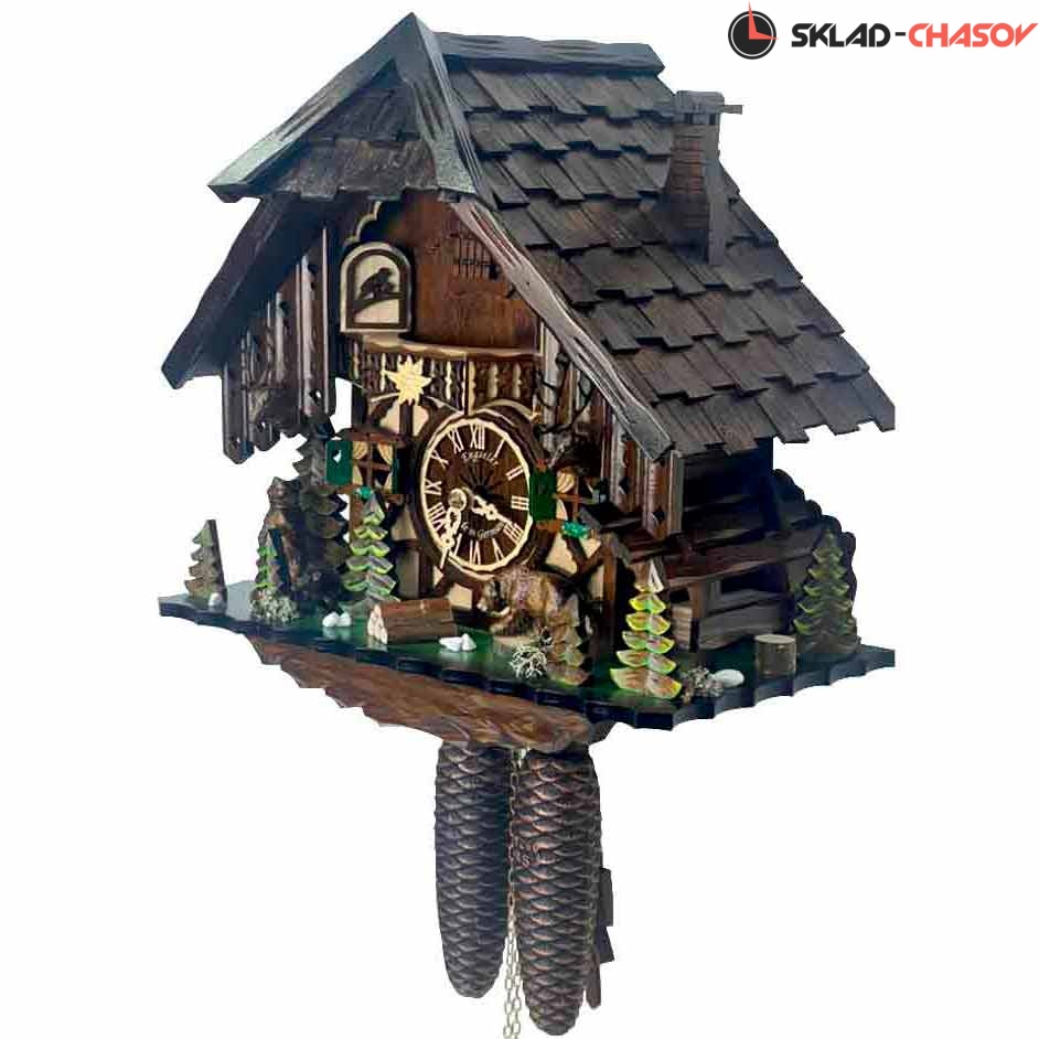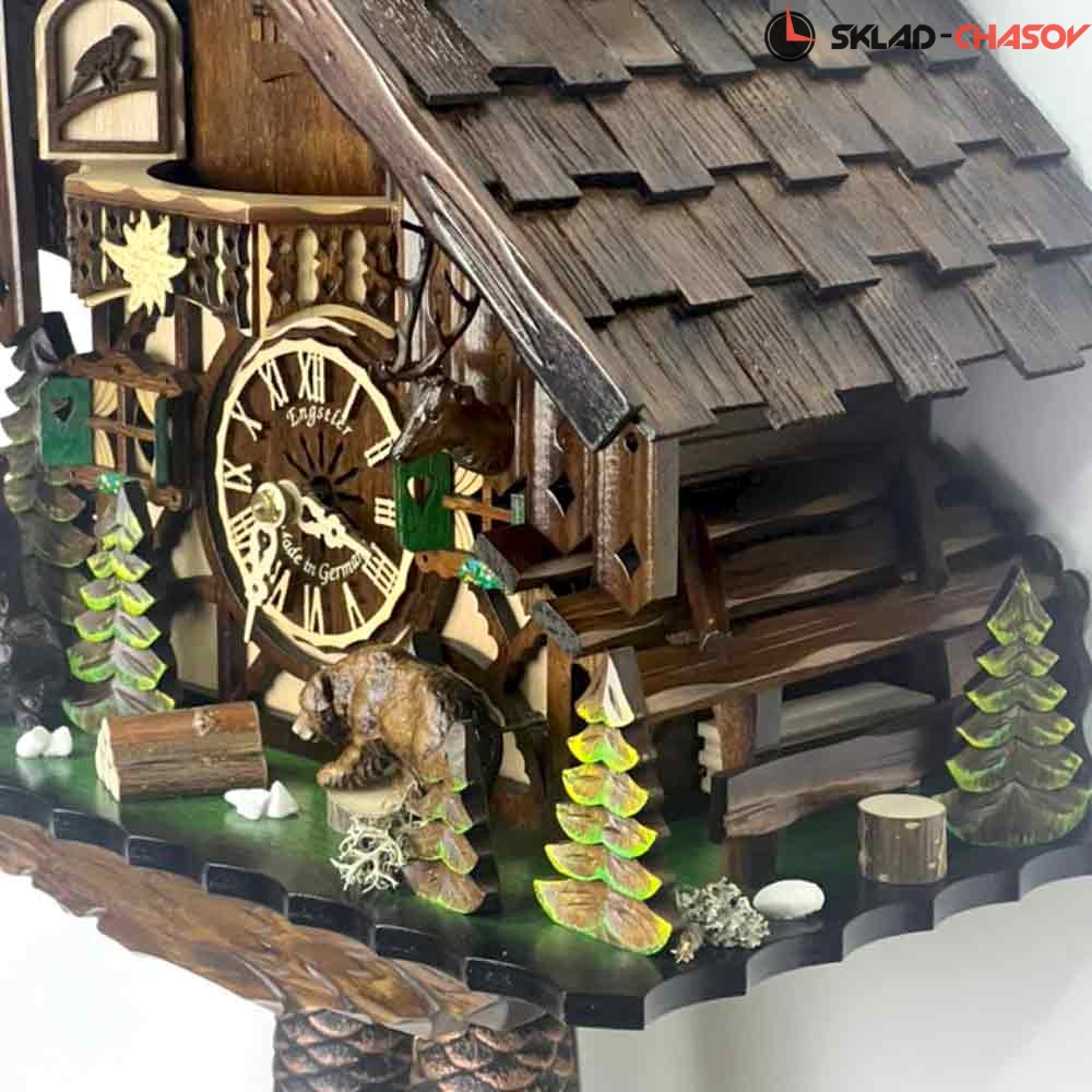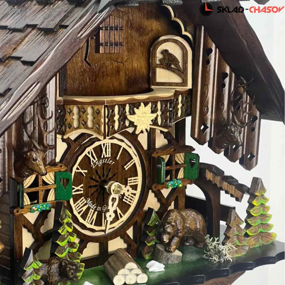 Часы механические с кукушкой SARS 48713/8-90 (Германия) имеют надежный немецкий механизм с заводом 8 дней и безупречное качество сборки и производства. Фасад часов украшают головы оленей справа и слева, рядом стоят два медведя, один из которых (правый) бьет лапой о пенёк во время кукования. По бокам и вокруг композиции находятся елочки, образовывая еловый лес.