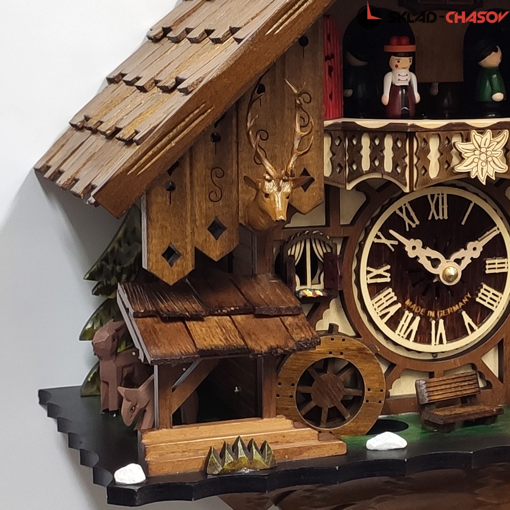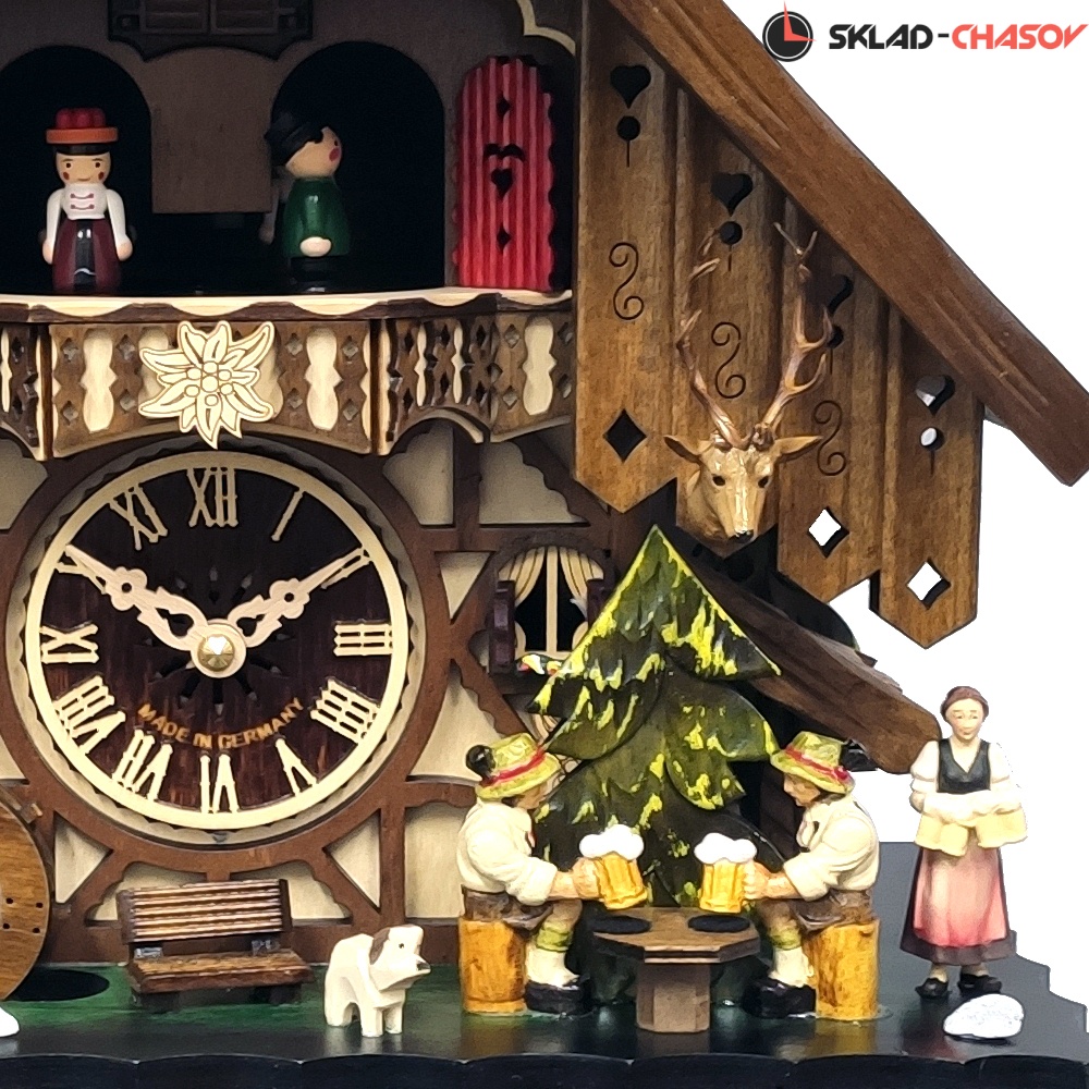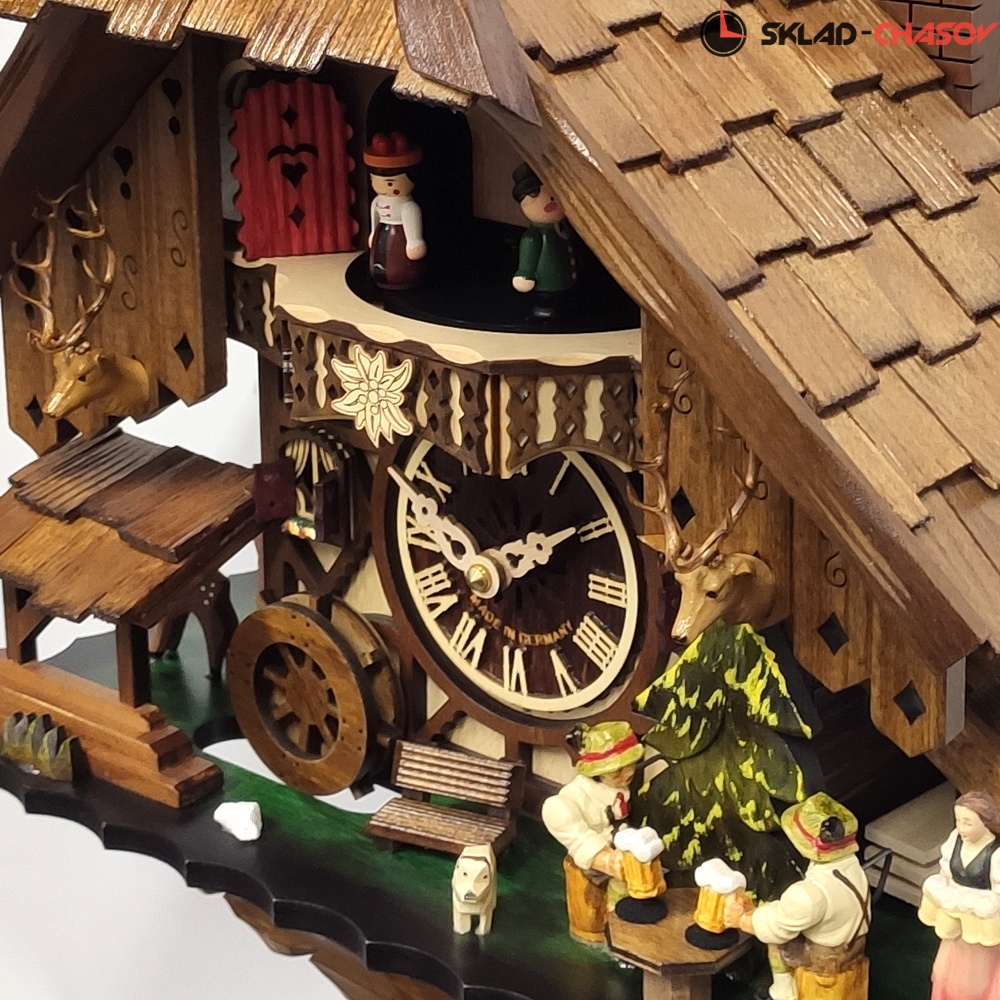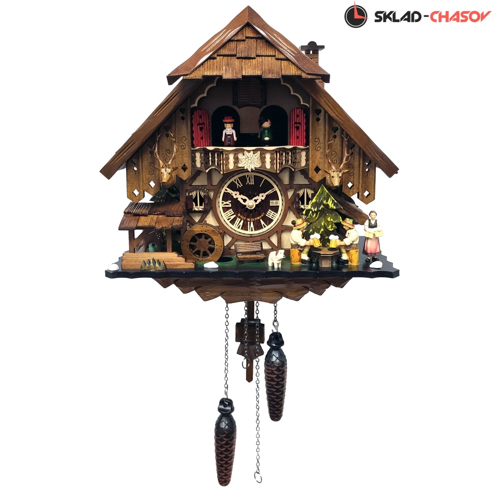 - Оригинальность этих настенных часов с кукушкой SARS подчеркивают вращающиеся при срабатывании кукушки фигурки- двигаются фигурки сверху, водяное колесо(слева) и мужики поднимают и опускают кружки пива (чёкаются), а женщина (без движения) по сюжету подносит еще кружки пенного.