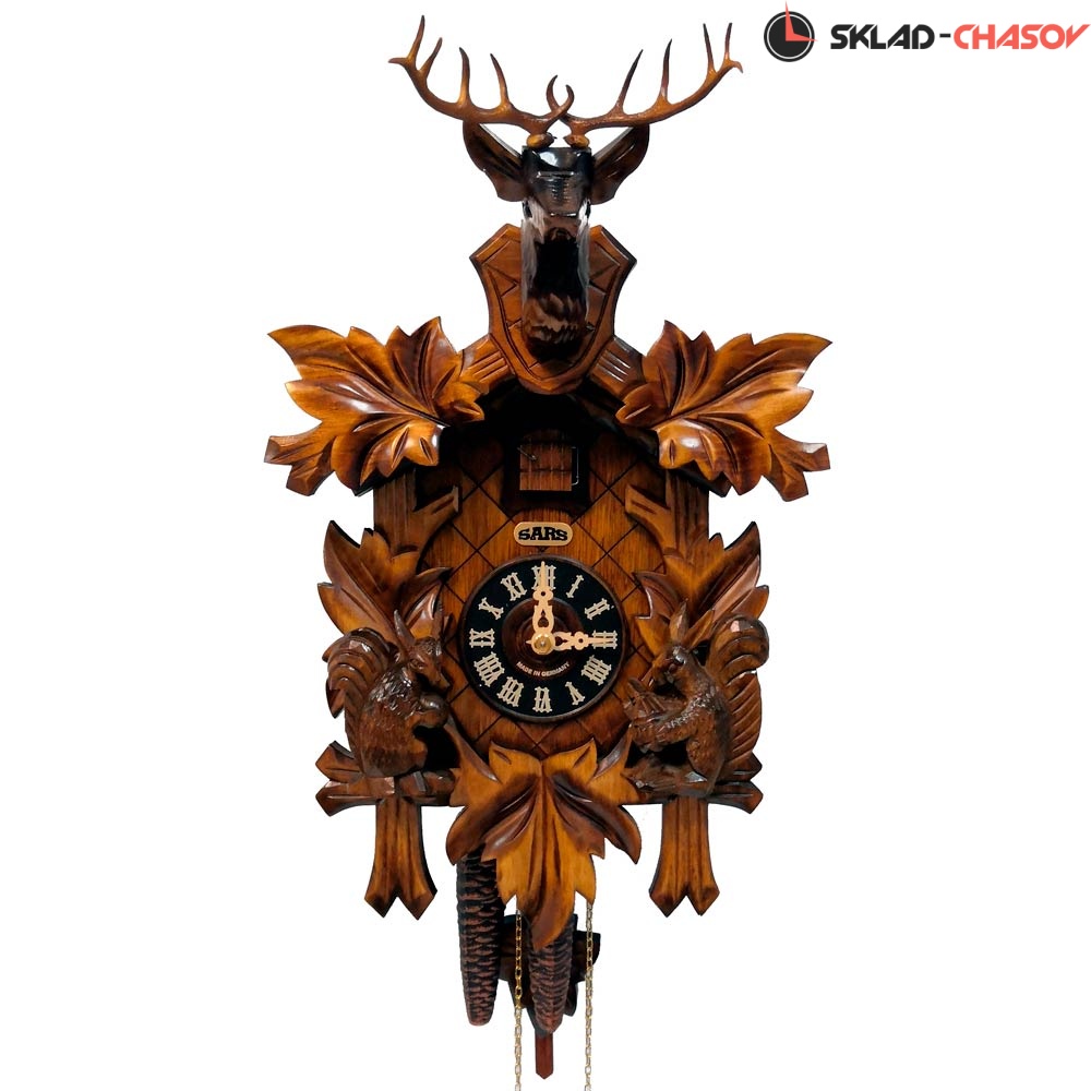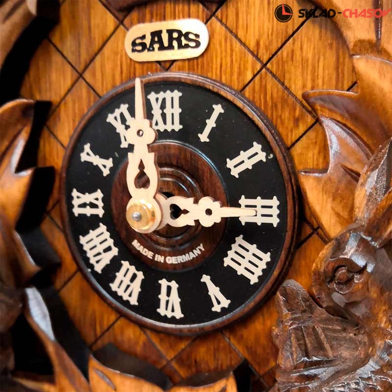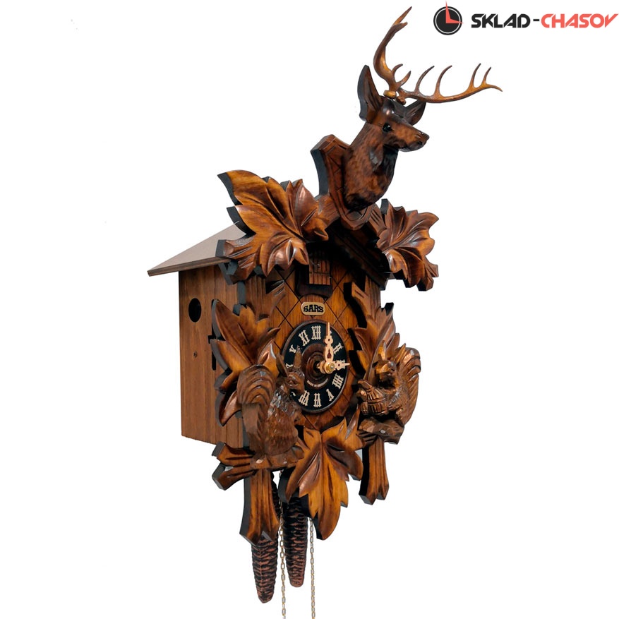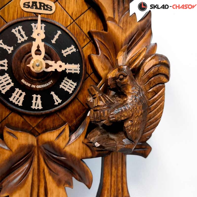 Механические часы с кукушкой SARS 0533-90 (Германия) имеют надежный немецкий механизм и безупречное качество сборки и производства. Фасад часов украшают голова оленя наверху и по бокам расположены белки.