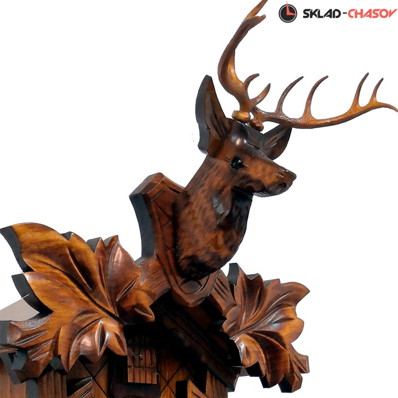 Кукушка срабатывает каждый час и кукует по количеству часов. Механизм: механика (Германия). Завод на 1 день. Размер: высота 40 см., Ширина 24 см. Глубина с учетом оленя 22 см.Ночной режим ручной. Корпус: дерево. Размер циферблата: 8 см.