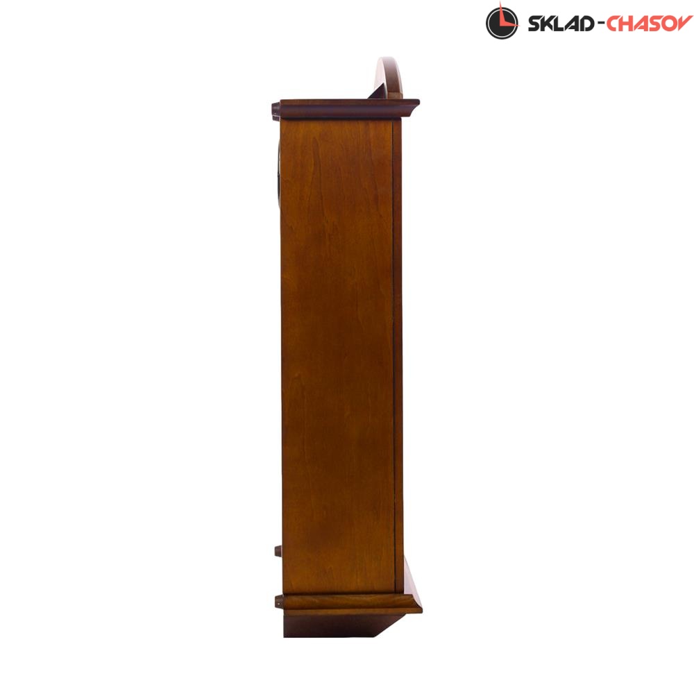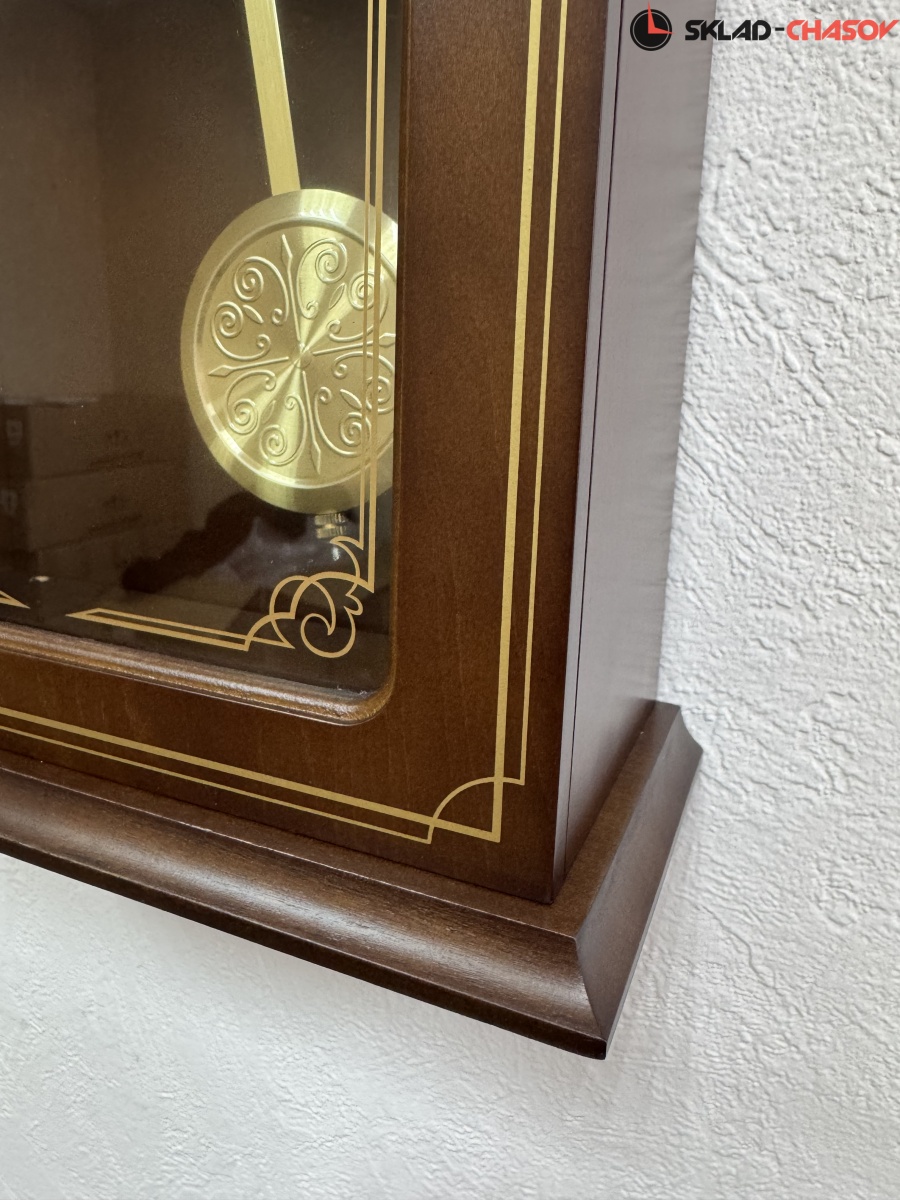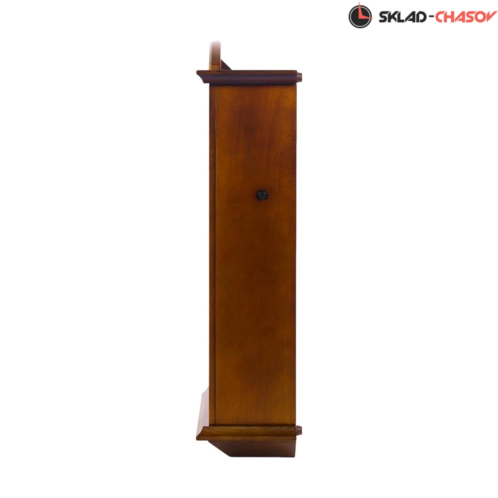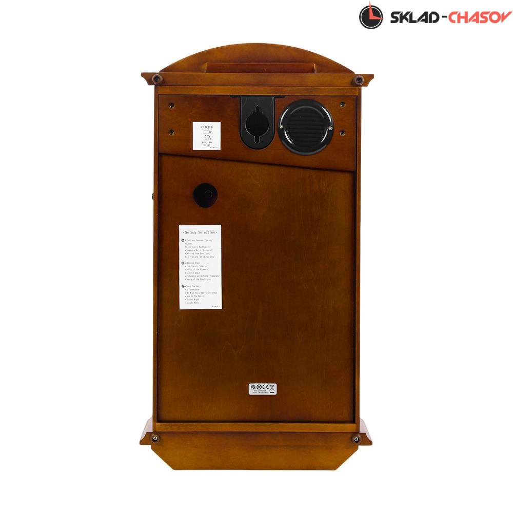 Коричневые настенные кварцевые часы с аналоговым циферблатом (стрелки). Стрелки: черная часовая, черная минутная. Бежевый циферблат с арабскими цифрами. Бесшумный механизм. 18 мелодий (3 пакета мелодия по 6 шт. на выбор). Регулировка громкости. Датчик освещенности (отключает воспроизведение мелодий в темноте). Корпус коричневого цвета выполнен из дерева. Под циферблатом в окне расположен маятник золотистого цвета.