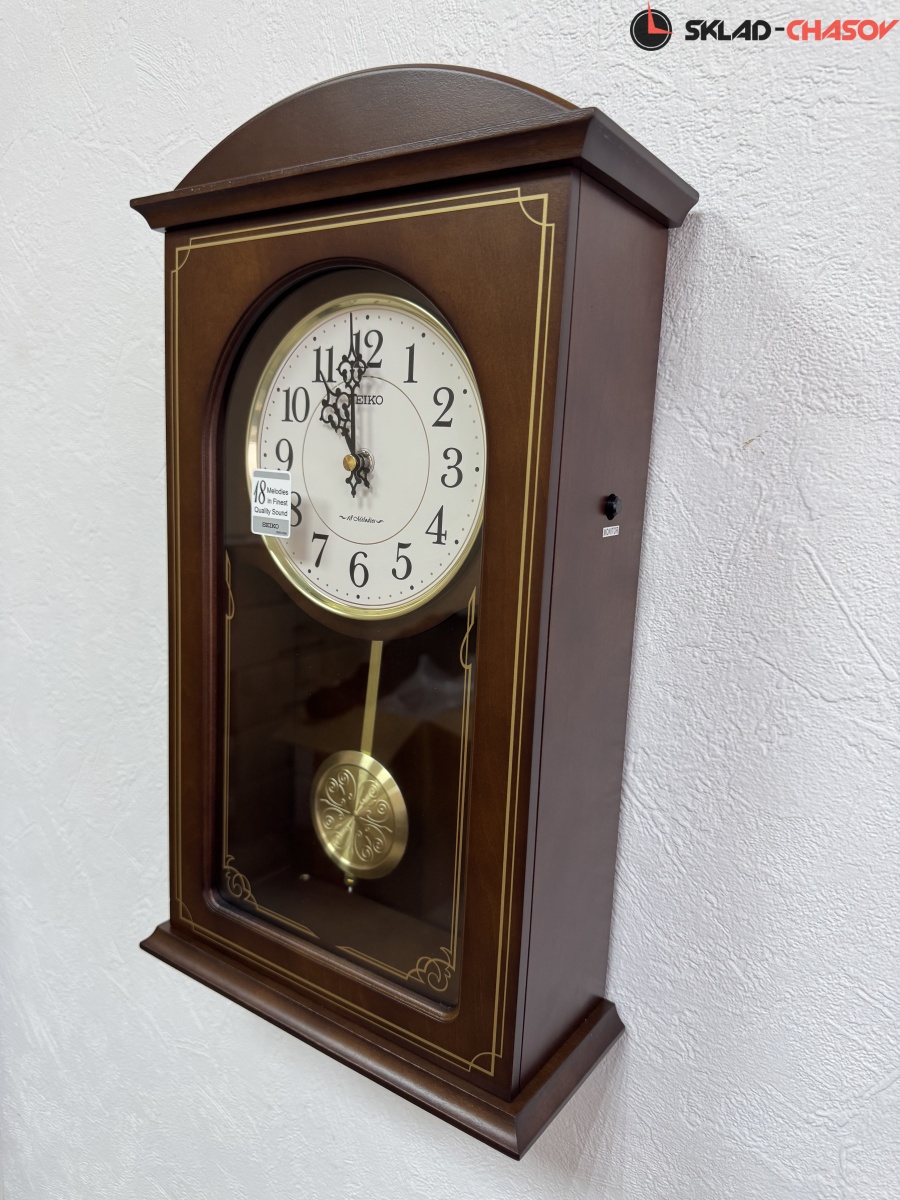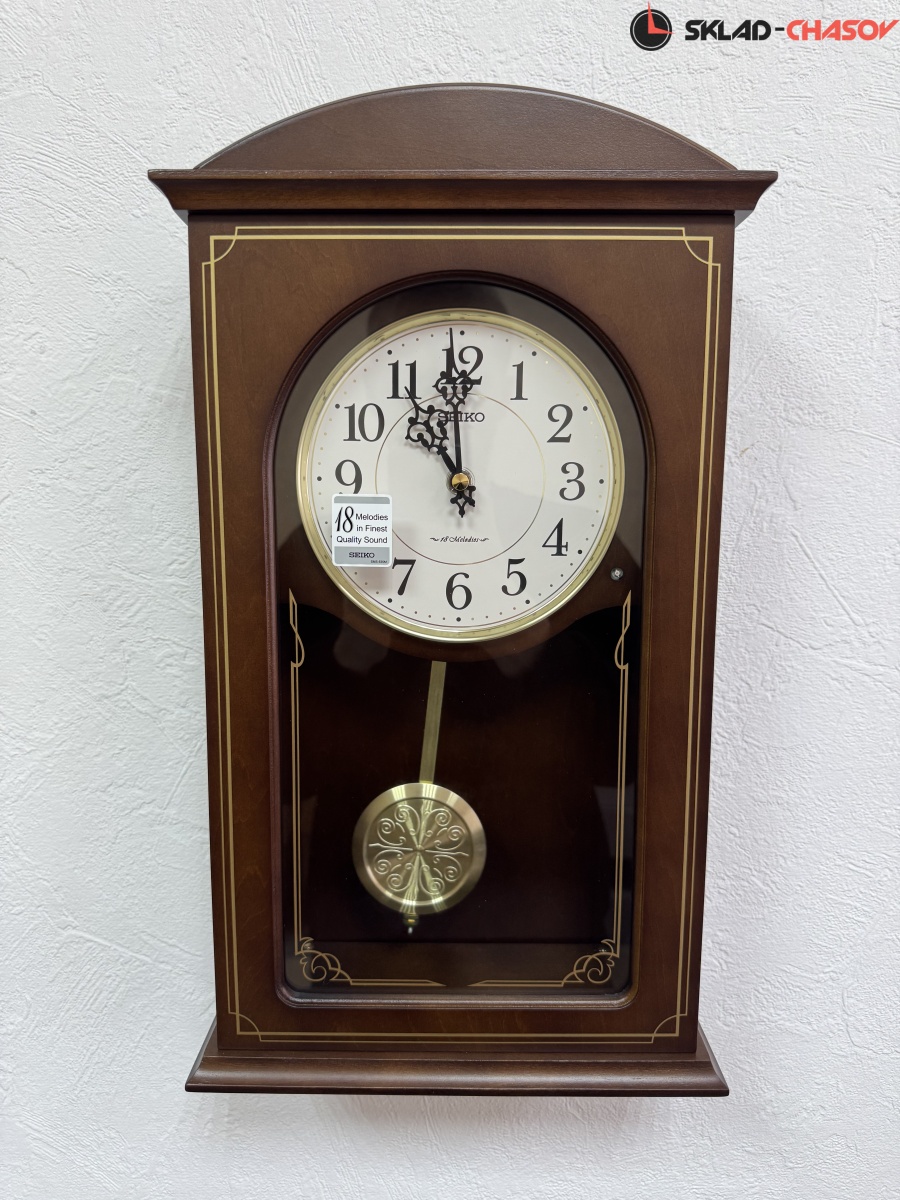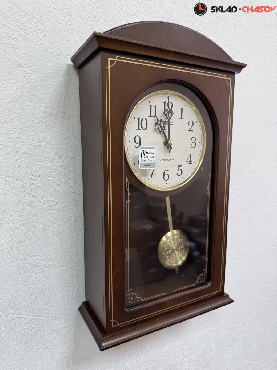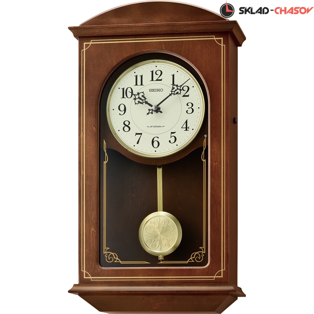 Коричневые настенные кварцевые часы с аналоговым циферблатом (стрелки). Стрелки: черная часовая, черная минутная. Бежевый циферблат с арабскими цифрами. Бесшумный механизм. 18 мелодий (3 пакета мелодия по 6 шт. на выбор). Регулировка громкости. Датчик освещенности (отключает воспроизведение мелодий в темноте). Корпус коричневого цвета выполнен из дерева. Под циферблатом в окне расположен маятник золотистого цвета.