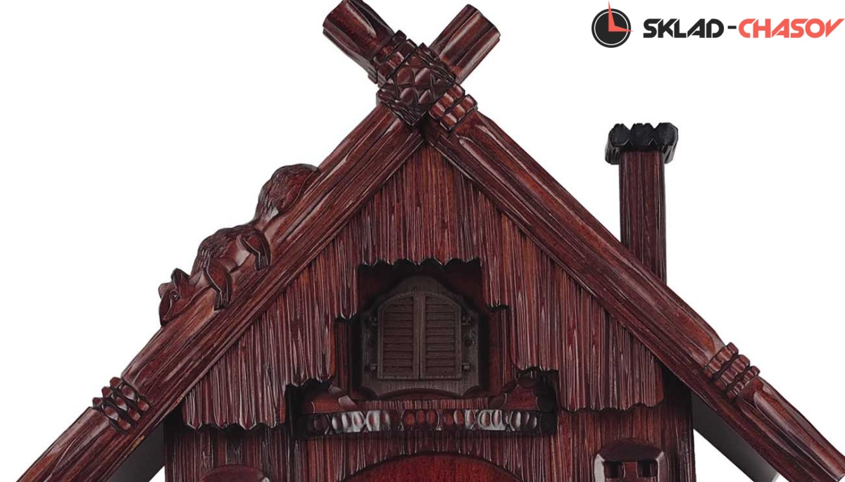 Корпус часов выполнен из дерева. Циферблат и стрелки вырезаны из дерева (метод лазерной резки). Римские цифры. Фронтон ручной работы, вырезан из липы. Часы вырезаны в виде домика с крышей и трубой, окнами с обеих сторон. Внизу еловый лес с оленем и лисой. Маятник, гири- шишки.