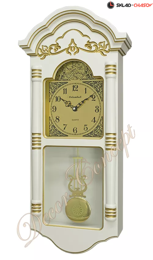 Настенные часы Columbus Co-1836 PG-WH с мелодией и боем с кварцевым механизмом. Корпус : натуральное дерево с резным фронтоном. Механизм : кварцевый. Размер: 67х29,5х12 см.Цвет: белый с золотой патиной. Мелодия : 4 типа - Westminster каждые 15 мин и часовой бой (в разных сочетаниях) ,а также Бим-Бам (Почасовой бой). Программное отключение звука с 22.00 до 5.00 часов. Питание : 4 элемента типа АА (R6). В комплект не входят