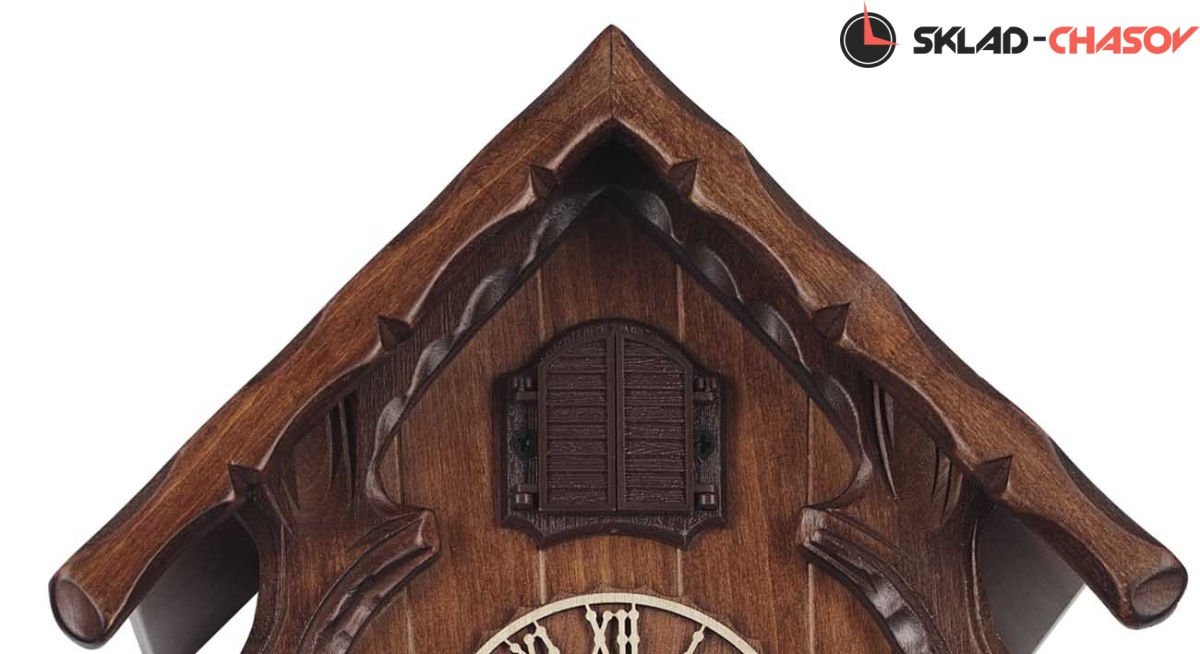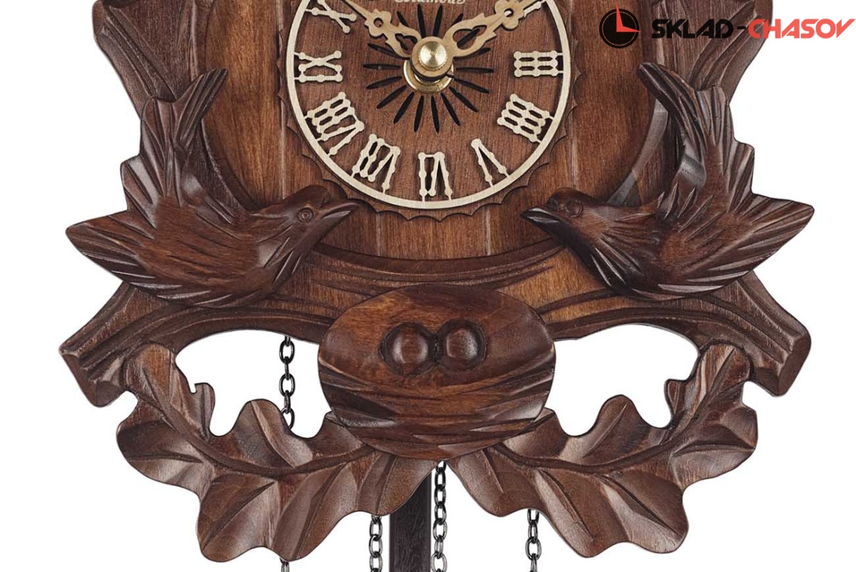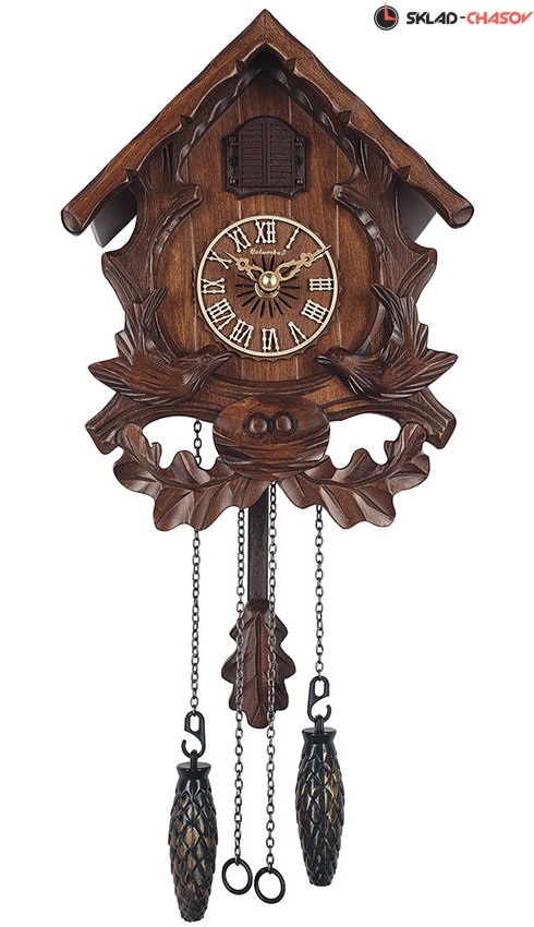 Кварцевые настенные часы с кукушкой Columbus CQ-056C еще называют "Две птицы" , на корпусе часов вырезаны две птицы. Циферблат выполнен римскими цифрами.