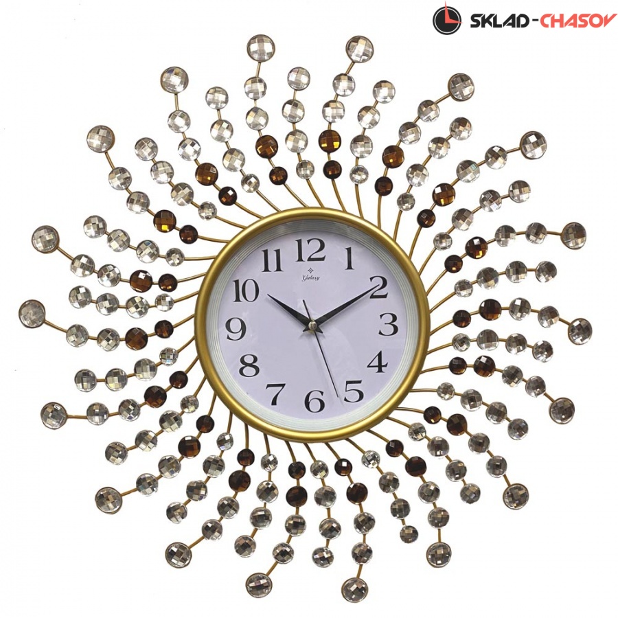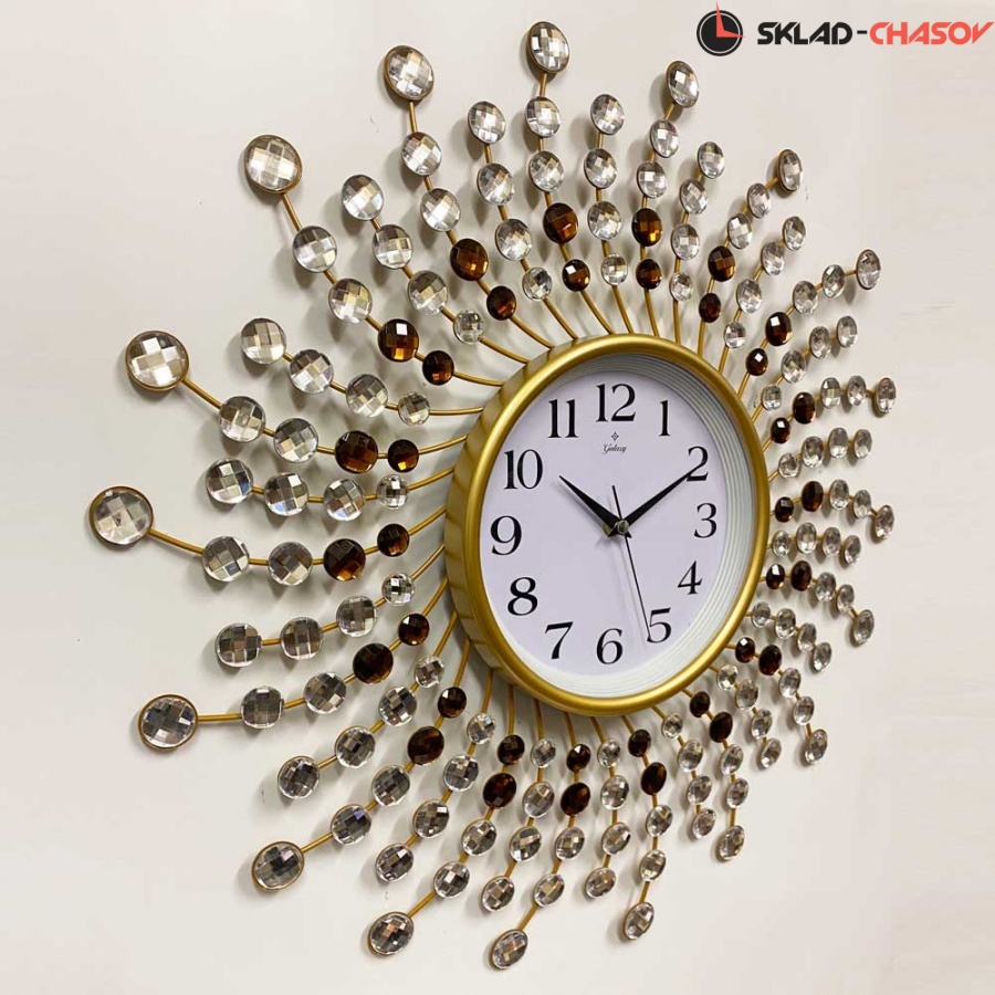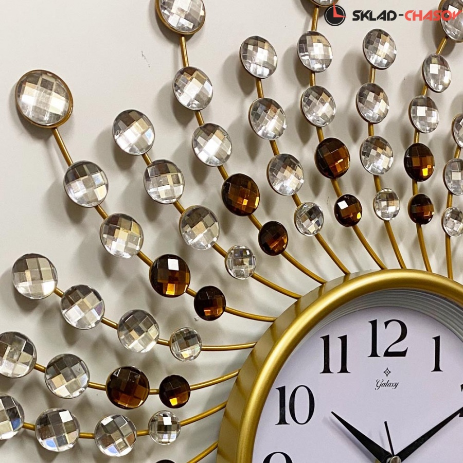 Настенные необычные часы GALAXY AYP-1045-K золотого цвета в иде солнышка имеют надежный бесшумный кварцевый механизм, работающий от батарейки типа АА (пальчиковые). Эта модель идеально подойдет для дома в гостиную комнату разных стилей, современный и декор.